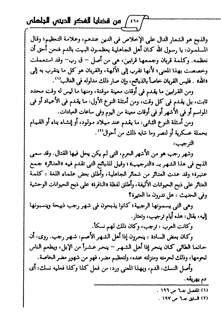 والذبح هو الشعار الدال على الإخلاص في الدين عندهم، وعلامة التعظيم؛ وقال المسلمون: يا رسول الله كان أهل الجاهلية يعظمون البيت بالدم فنحن أحق أن نعظمه. وكلمة قربان وجمعها قرابين، هي من أصل "ق ر ب" وقد استعملت وخصصت بهذا المعنى؛ لأنها تقرب إلى الآلهة، والقربان هو كل ما يتقرب به إلى "الله". فليس القربان خاصا بالذبائح، وإن صار ذلك مدلوله في الغالب1.