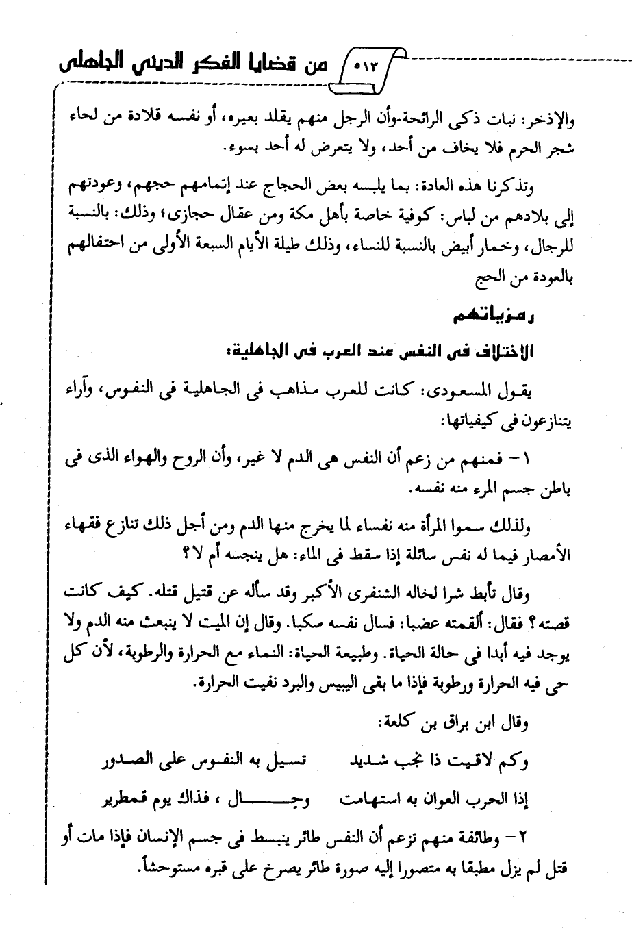 يقول المسعودي: كانت للعرب مذاهب في الجاهلية في النفوس، وآراء يتنازعون في كيفياتها: