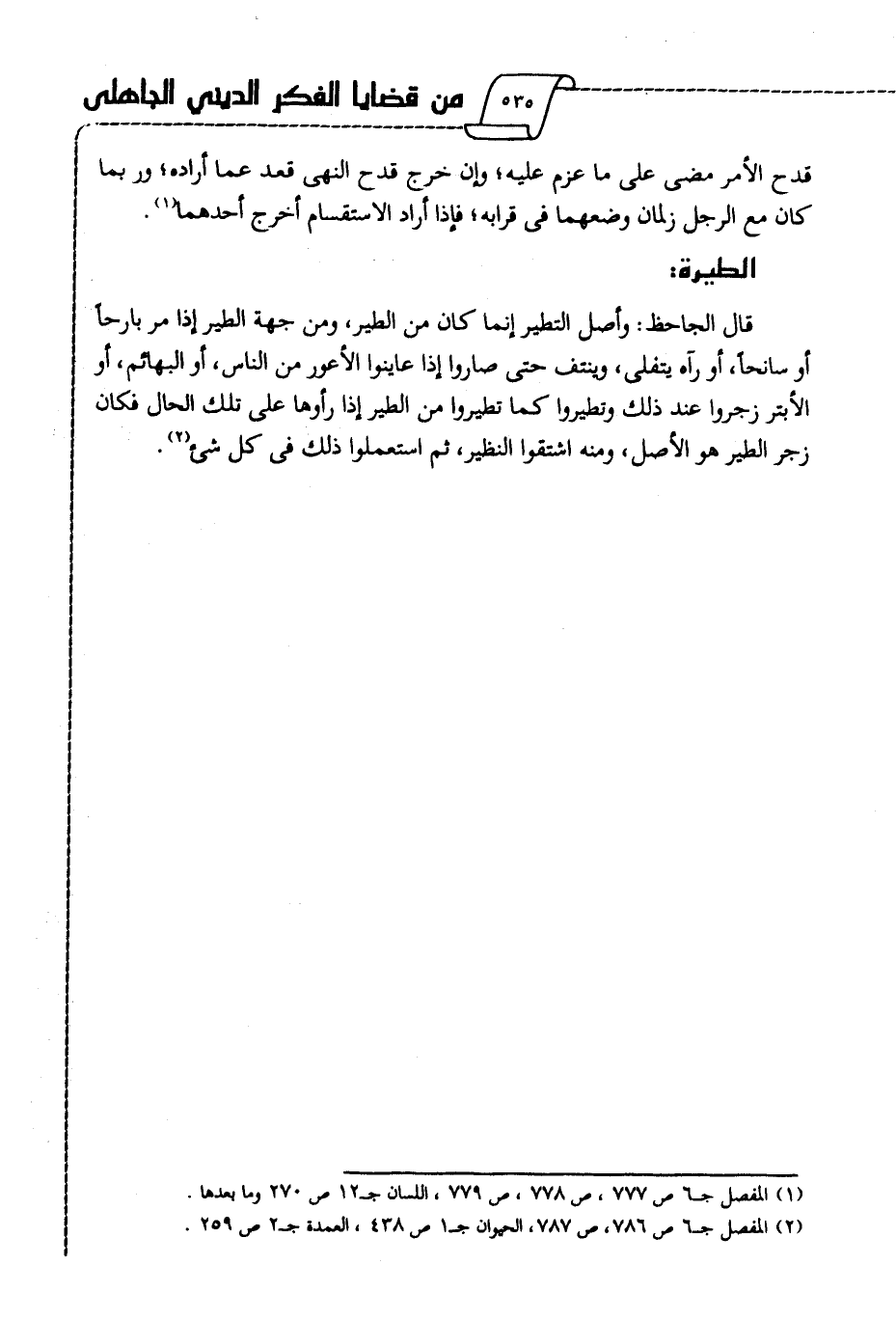 قال الجاحظ: وأصل التطير إنما كان من الطير، ومن جهة الطير إذا مر بارحا أو سانحا، أو رآه يتفلى، وينتف حتى صاروا إذا عاينوا الأعور من الناس، أو البهائم، أو الأبتر زجروا عند ذلك وتطيروا كما تطيروا من الطير إذا رأوها على تلك الحال فكان زجر الطير هو الأصل، ومنه اشتقوا التطير، ثم استعملوا ذلك في كل شيء2.