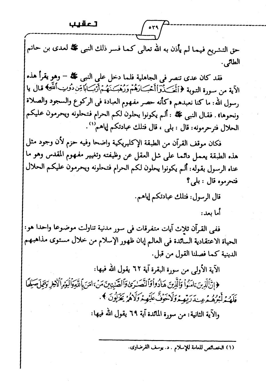 فكان موقف القرآن من الطبقة الإكليريكية واضحًا وفيه حزم؛ لأن وجود مثل هذه الطبقة يعمل دائمًا على شلِّ العقل عن وظيفته وتغيير مفهوم المقدس، وهو ما عناه الرسول بقوله: "ألم يكونوا يحلون لكم الحرام فتحلونه ويحرمون عليكم الحلال فتحرموه؟ " قال: بلى، قال الرسول: "فتلك عبادتكم إياهم".