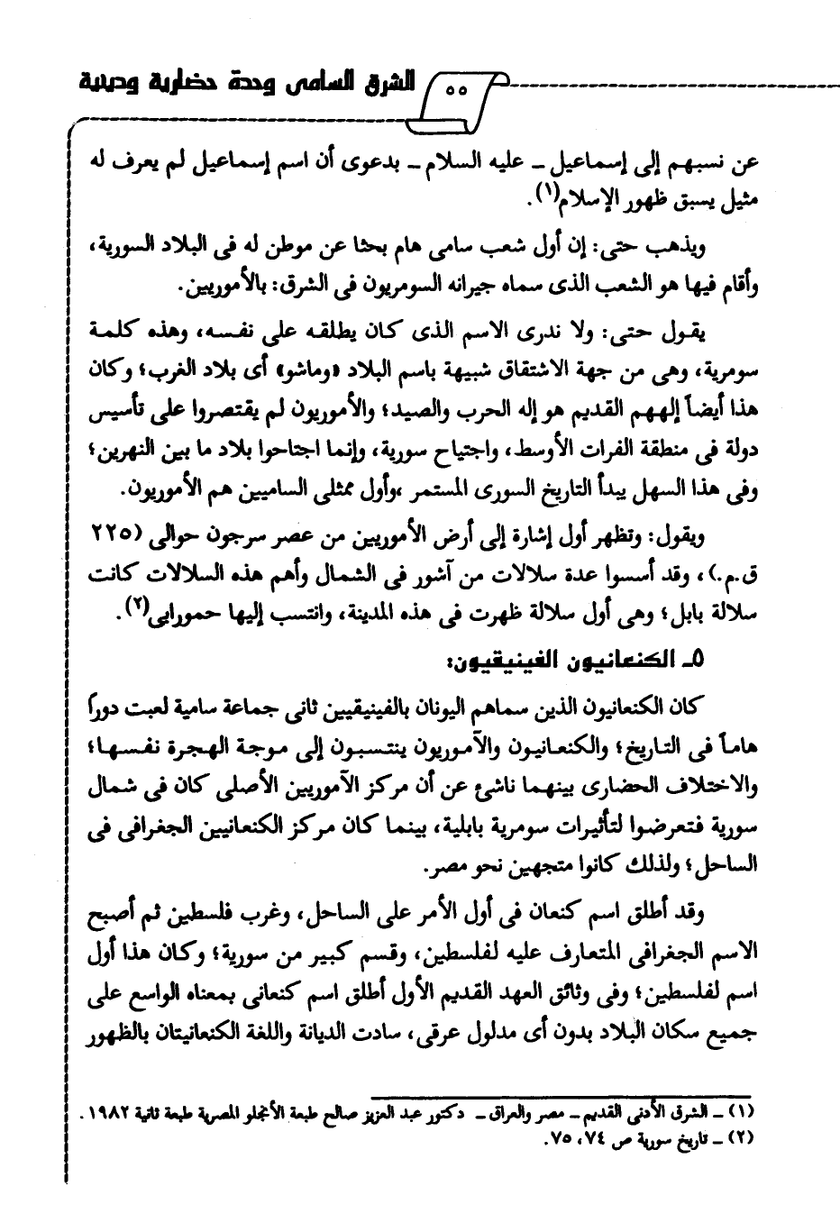 كان الكنعانيون الذي سماهم اليونان بالفينيقيين ثاني جماعة سامية لعبت دورا هاما في التاريخ؛ والكنعانيون والآموريون ينتسبون إلى موجة الهجرة نفسها، والاختلاف الحضاري بينهما ناشئ عن أن مركز الآموريين الأصلي كان في شمال سورية فتعرضوا لتأثيرات سومرية بابلية، بينما كان مركز الكنعانيين الجغرافي في الساحل، ولذلك كانوا متجهين نحو مصر.