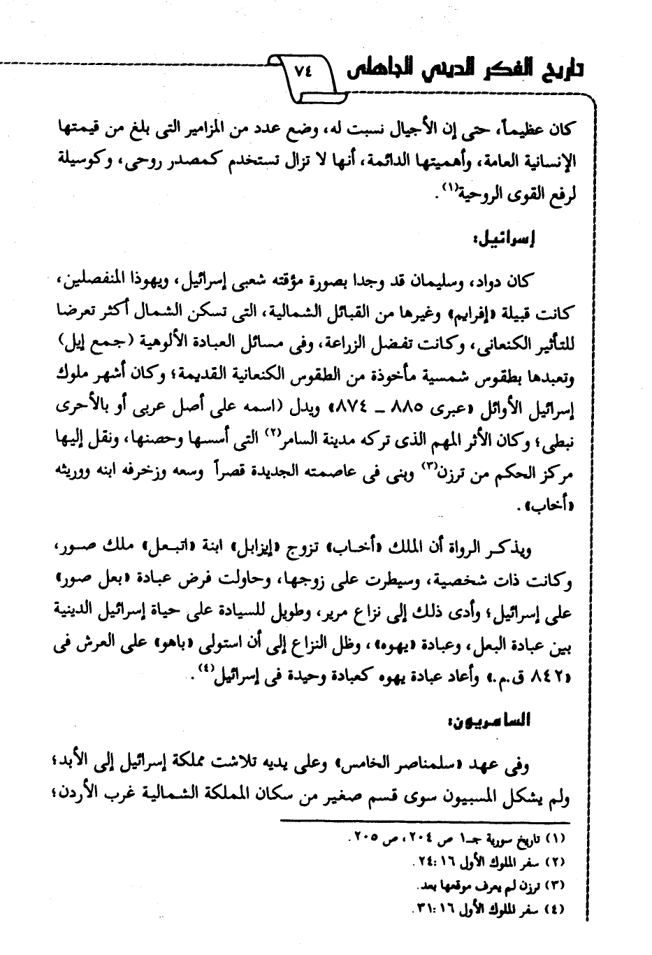 كان داود وسليمان قد وحدا بصورة مؤقتة شعبي إسرائيل، ويهوذا المنفصلين، كانت قبيلة "إفرايم" وغيرها من القبائل الشمالية التي تسكن الشمال أكثر تعرضا للتأثير الكنعاني، وكانت تفضل الزراعة، وفي مسائل العبادة الألوهية "جمع إبل" وتعبدها بطقوس شمسية مأخوذة من الطقوس الكنعانية القديمة؛ وكان أشهر ملوك إسرائيل الأوائل "عبري 885-874" ويدل "اسمه على أصل عربي أو بالأحرى نبطي؛ وكان الأثر المهم الذي تركه مدينة السامر2 التي أسسها وحصنها، ونقل إليها مركز الحكم من ترزن3 وبنى في عاصمته الجديدة قصران وسَّعه وزخرفه ابنه ووريثه "أخاب".