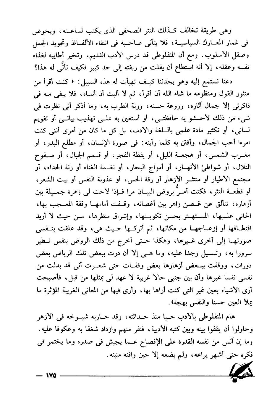 وهي طريقة تخالف كذلك النثر الصحفي الذي يكتب لساعته، ويخوض فيغمار المعارك السياسية، فلا يتأنى صاحبه في انتقاء الألفاظ وتجويد الجمل وصقل الأسلوب، ومع أن المنفلوطي قد درس الأدب القديم، وتخير أطايبه لغذاء نفسه وعقله، إلا أنه استطاع أن يفلت من ربقته إلى حد كبير فكيف تأتى له هذا؟