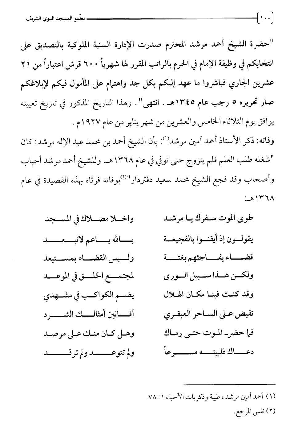 (1) أحمد أمين مرشد، طيبة وذكريات الأحبه، 1: 78.