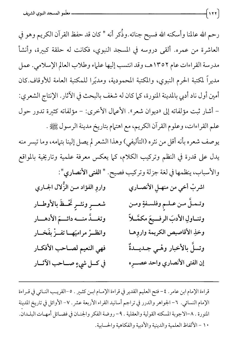 والأسباب، ينظمها في لغة جزلة وتركيب فصيح. " الفتى الأنصاري":