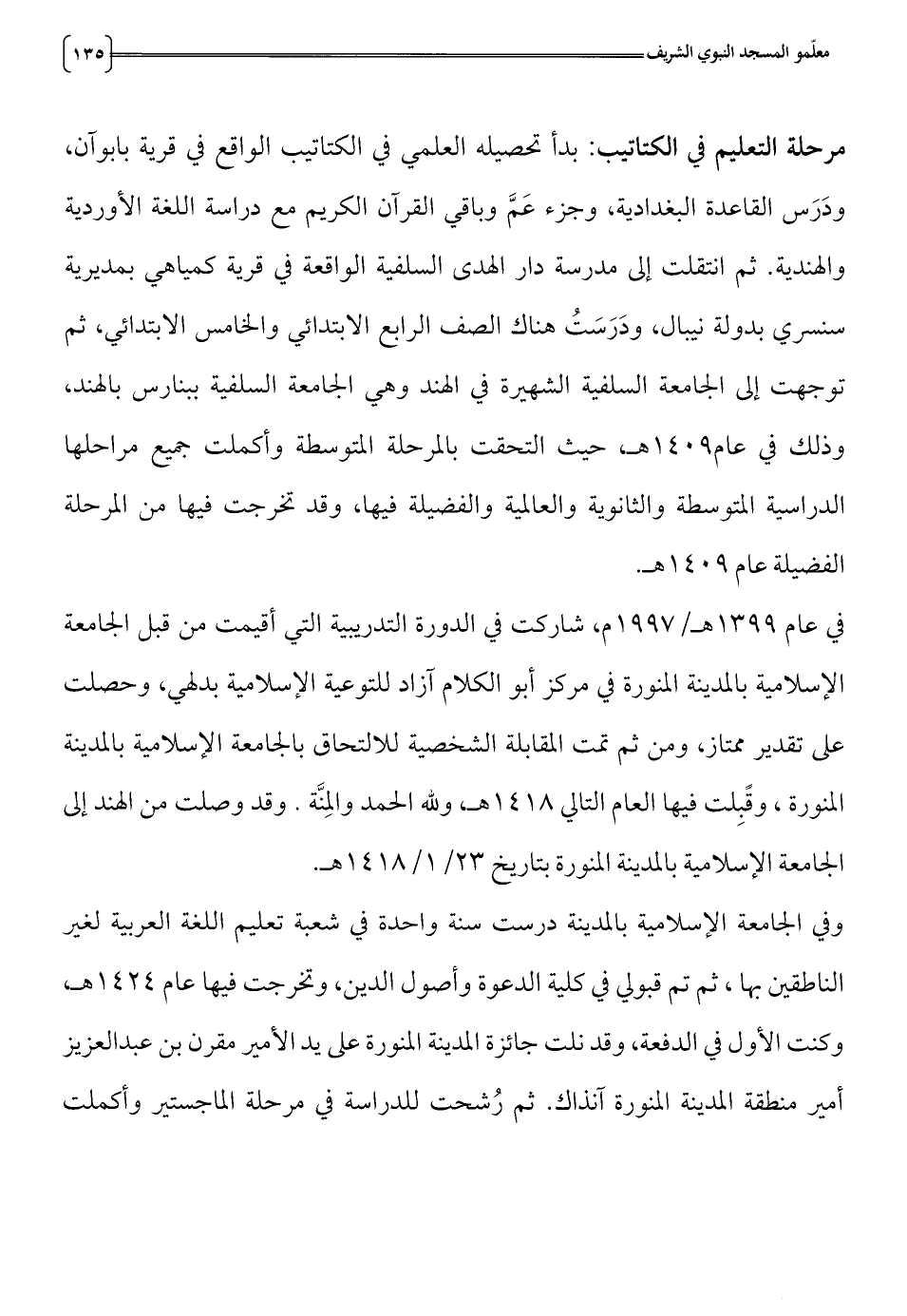 المنورة، وقبلت فيها العام التالي 18 4 1 هـ، ولله الحمد والمنة. وقد وصلت من الهند إلى