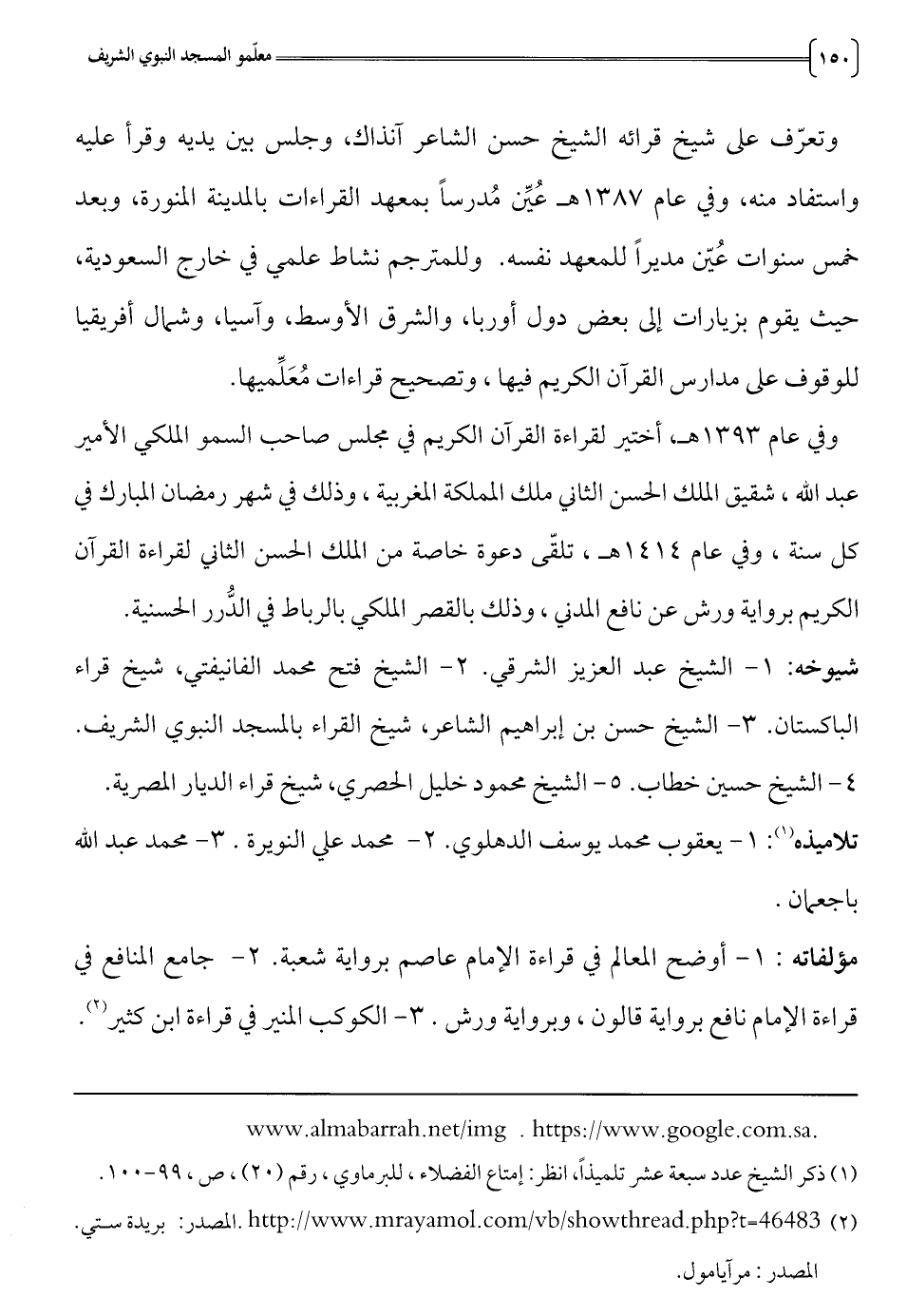 الباكستان. 3 - الشيخ حسن بن إبراهيم الشاعر، شيخ القراء بالمسجد النبوي الشريف.