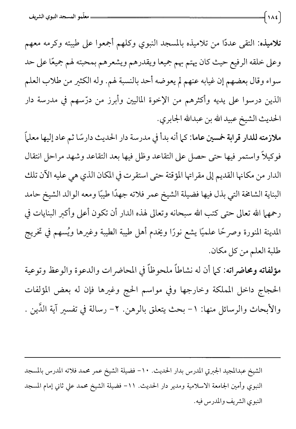 الشيخ عبدالمجيد الجبرتي المدرس بدار الحديث. 10 - فضيلة الشيخ عمر محمد فلاته المدرس بالمسجد