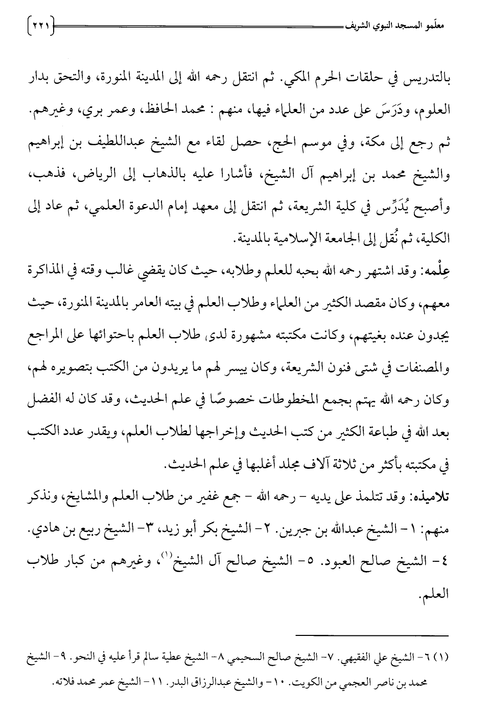 (1) 6 - الشيخ علي الفقيهي. 7 - الشيخ صالح السحيمي 8 - الشيخ عطية سالم قرأ عليه في النحو. 9 - الشيخ محمد بن ناصر العجمي من الكويت. 10 - والشيخ عبدالرزاق البدر. 11 - الشيخ عمر محمد فلاته.