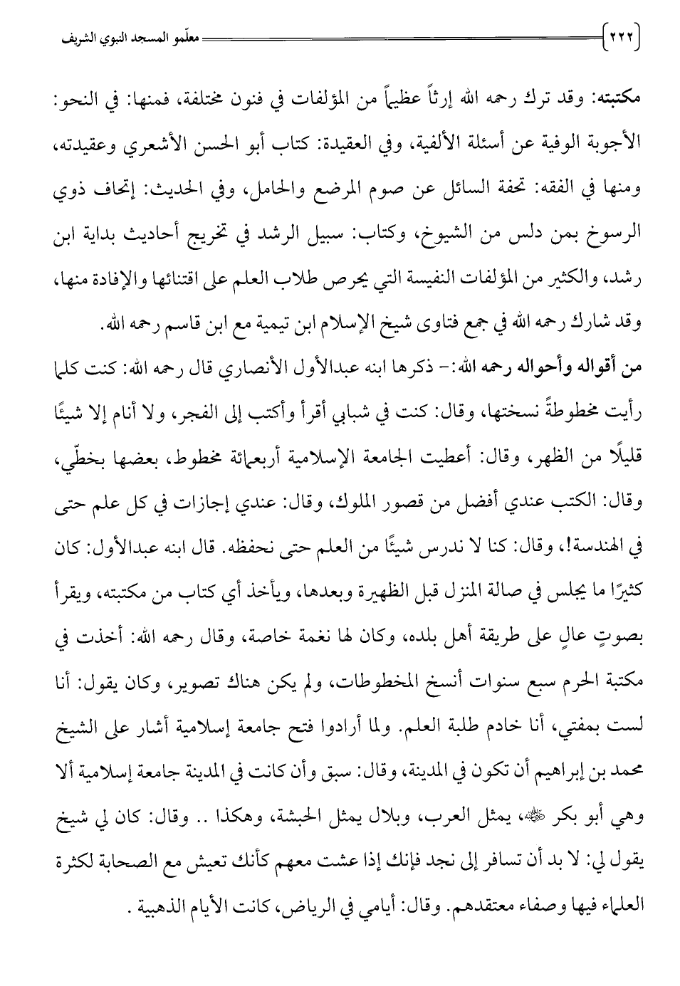 قليلا من الظهر، وقال: أعطيت الجامعة الإسلامية أربعمائة مخطوط، بعضها بخطي،