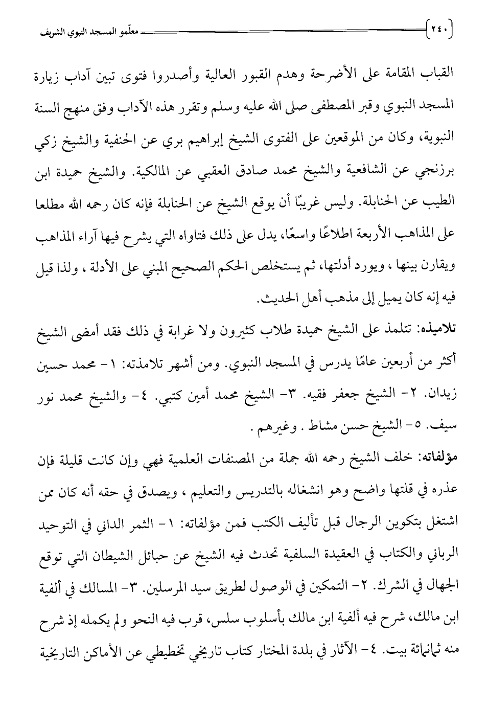 برزنجي عن الشافعية والشيخ محمد صادق العقبي عن المالكية. والشيخ حميدة ابن