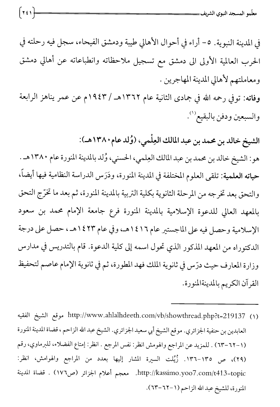 العابدين بن حنفية الجزائري. موقع الشيخ أبي سعيد الجزائري. الشيخ عبد الله الزاحم، قضاة المدينة المنورة