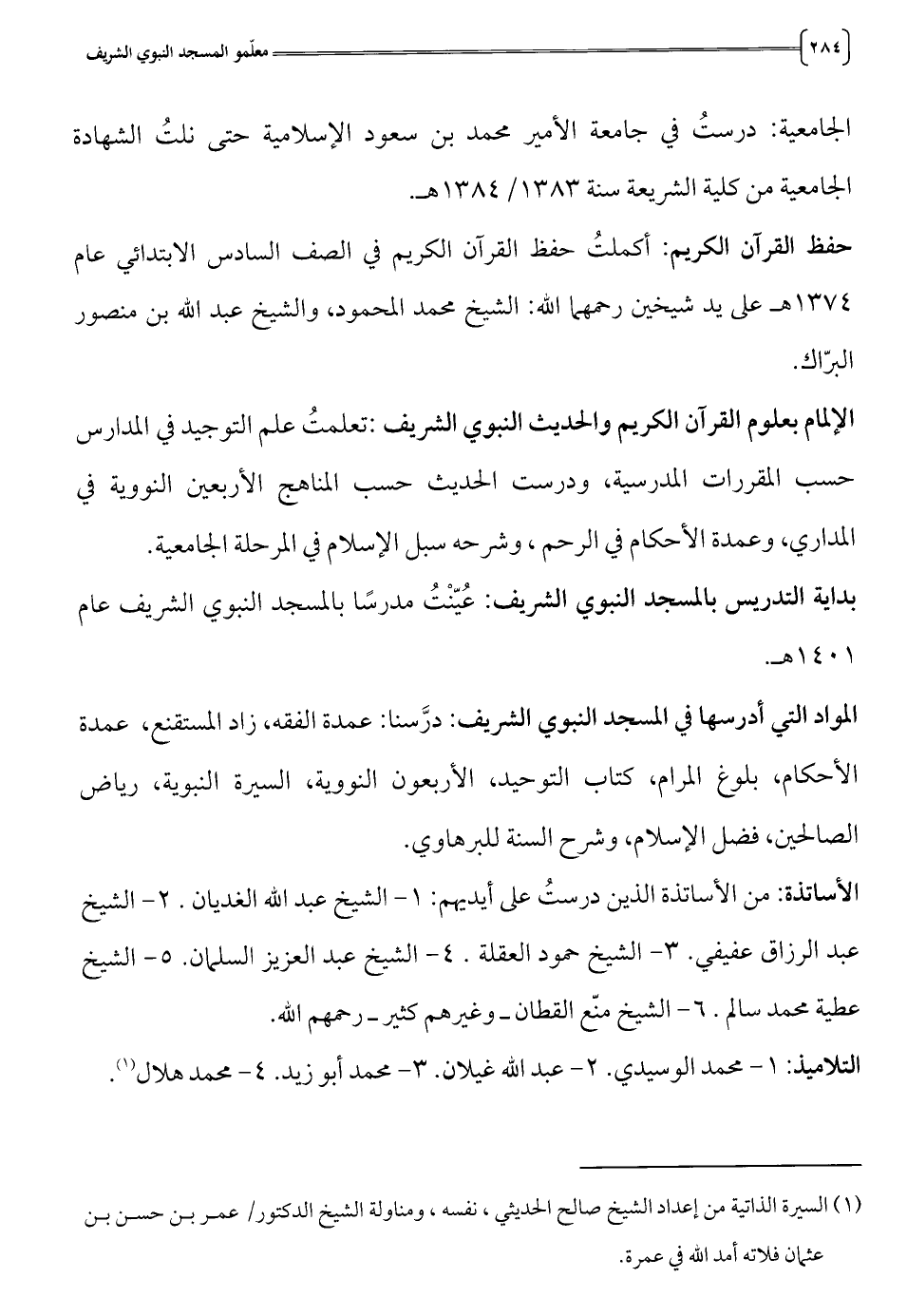 (1) السيرة الذاتية من إعداد الشيخ صالح الحديثي، نفسه، ومناولة الشيخ الدكتور/عمر بن حسن بن