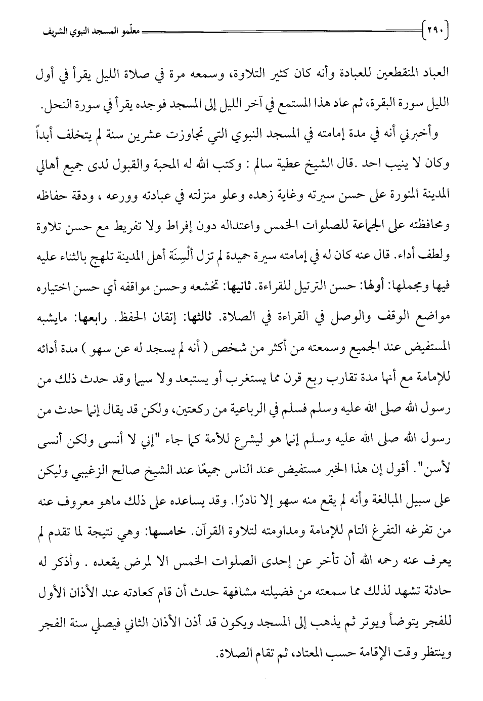 وأخبرني أنه في مدة إمامته في المسجد النبوي التي تجاوزت عشرين سنة لم يتخلف أبدا