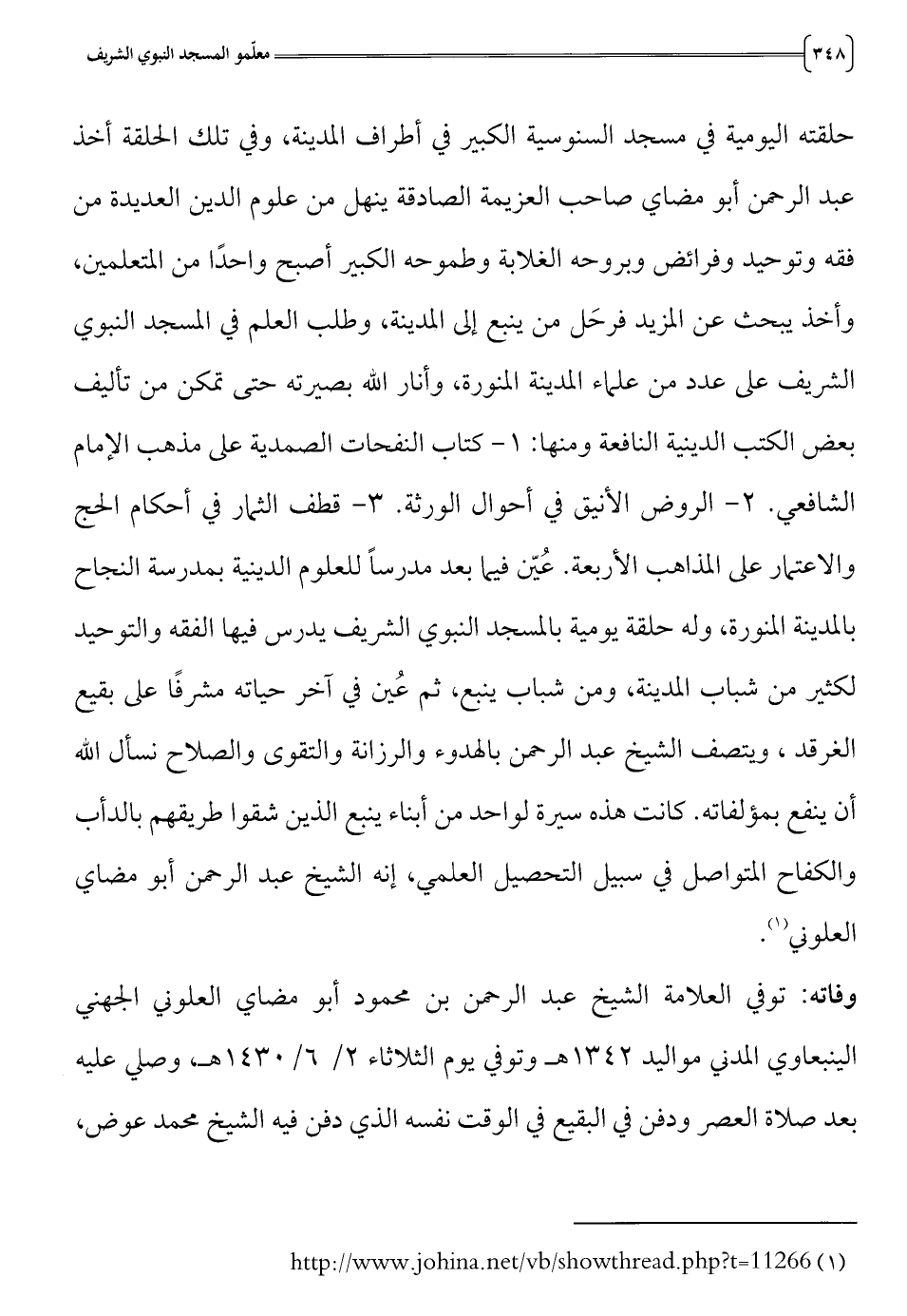 بالمدينة المنورة، وله حلقة يومية بالمسجد النبوي الشريف يدرس فيها الفقه والتوحيد