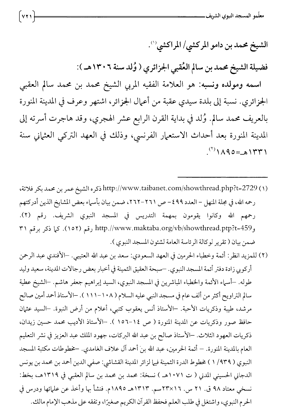 فضيلة الشيخ محمد بن سالم العقبي الجزائري (ولد سنة 6 0 13 هـ):
