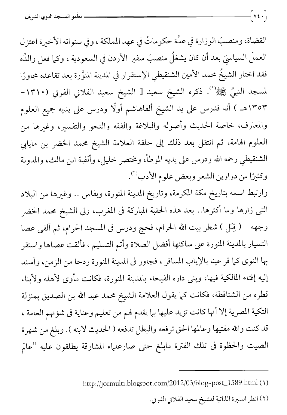 لمسجد النبي - صلى الله عليه وسلم -. ذكره الشيخ سعيد [الشيخ سعيد الفلاني الفوتي (1310 -