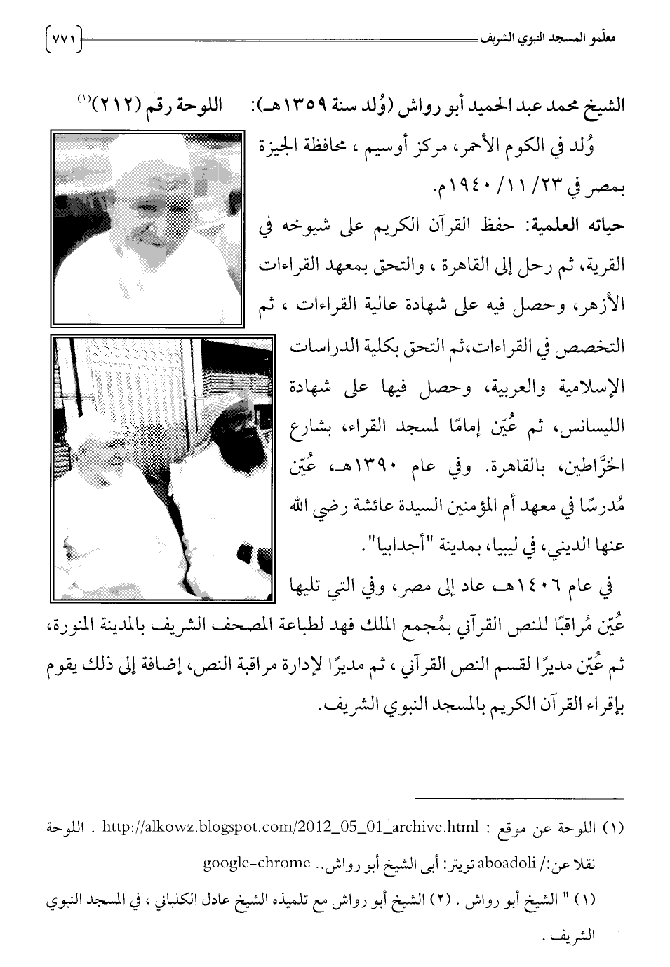 (1) " الشيخ أبو رواش. (2) الشيخ أبو رواش مع تلميذه الشيخ عادل الكلباني، في المسجد النبوي الشريف.