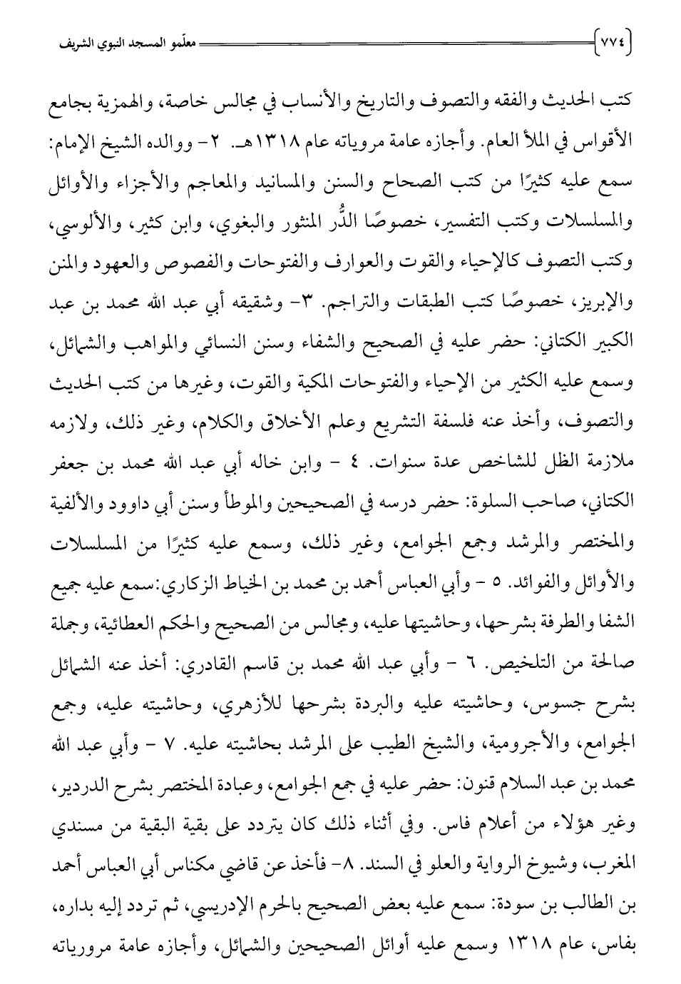 الكبير الكتاني: حضر عليه في الصحيح والشفاء وسنن النسائي والمواهب والشمائل،