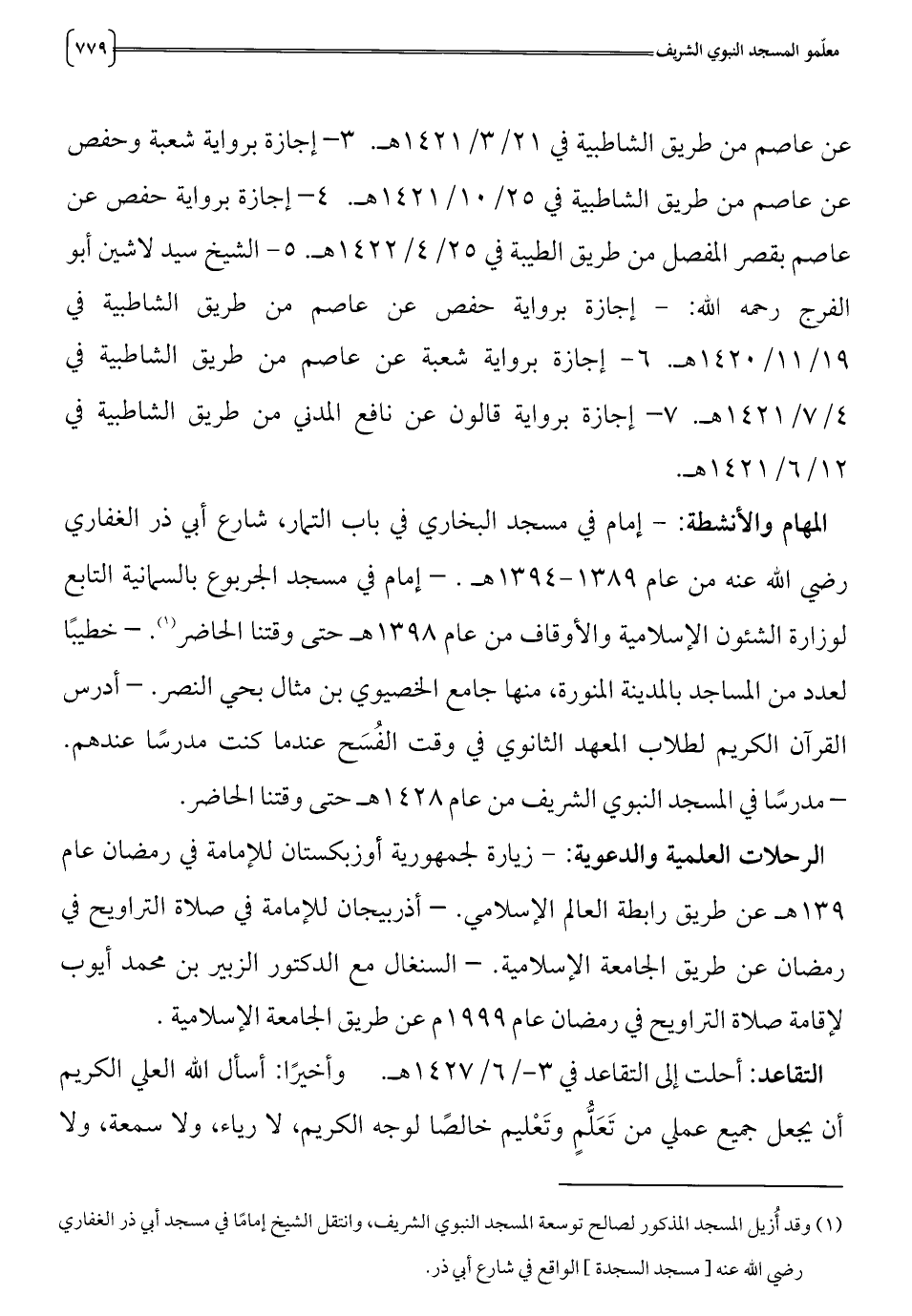 (1) وقد أزيل المسجد المذكور لصالح توسعة المسجد النبوي الشريف، وانتقل الشيخ إماما في مسجد أبي ذر الغفاري