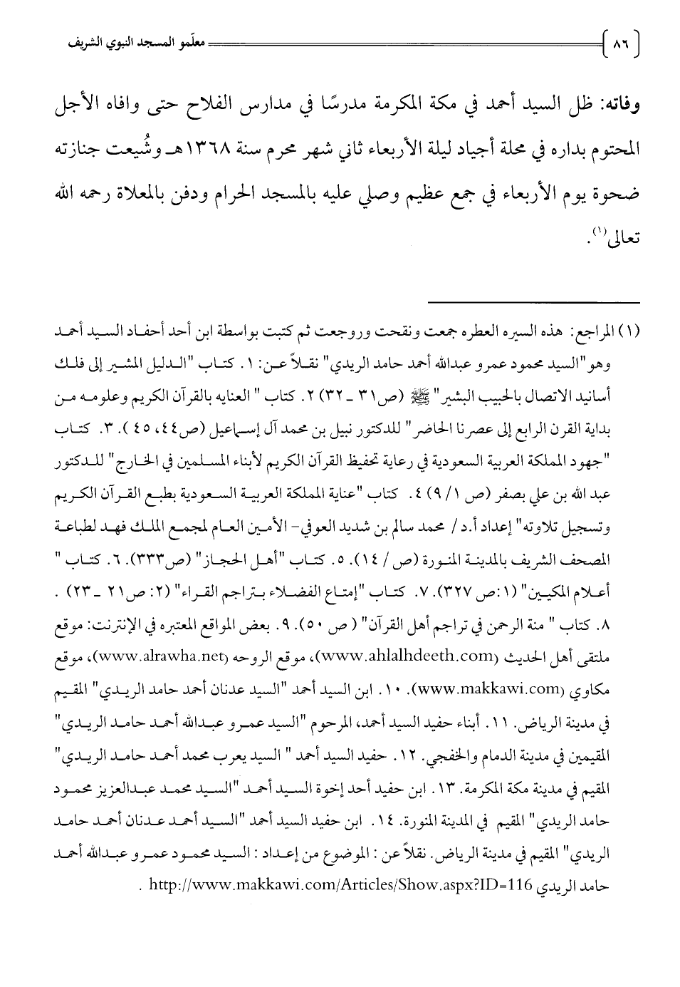 ملتقى أهل الحديث ( www.ahlalhdeeth.com )، موقع الروحه ( www.alrawha.net)، موقع مكاوي www.makkawi.com. 10 - ابن السيد أحمد "السيد عدنان أحمد حامد الريدي " المقيم في مدينة الرياض. 11. أبناء حفيد السيد أحمد، المرحوم "السيد عمرو عبدالله أحمد حامد الريدي "