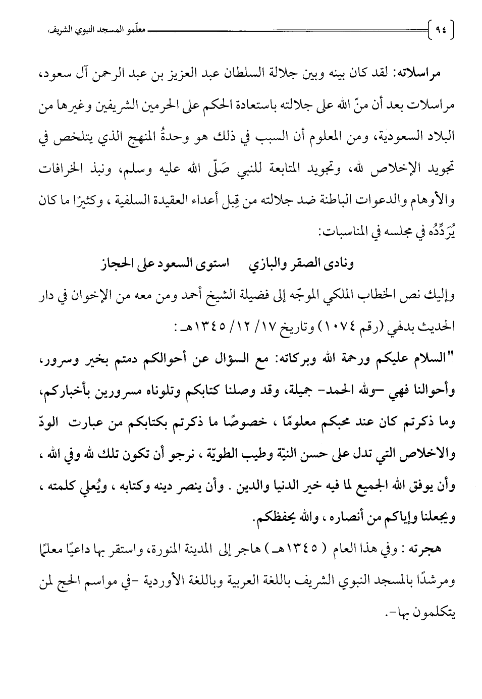 هجرته: وفي هذا العام (1345 هـ) هاجر إلى المدينة المنورة، واستقر بها داعيا معلما