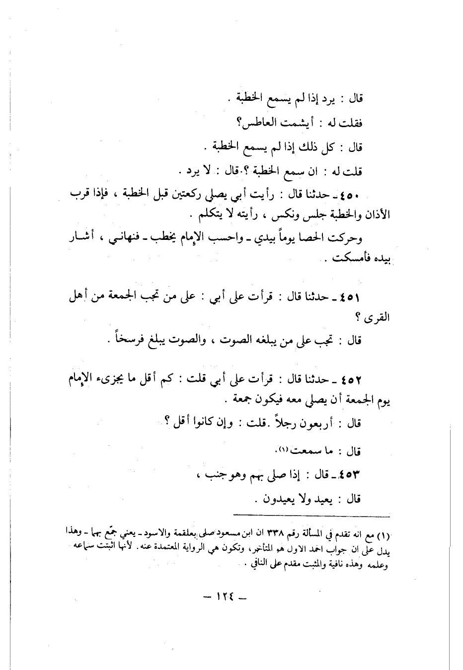 452 - حَدثنَا قَالَ قَرَأت على ابي قلت كم اقل مَا يُجزئ الامام يَوْم الْجُمُعَة ان يُصَلِّي مَعَه فَيكون جُمُعَة