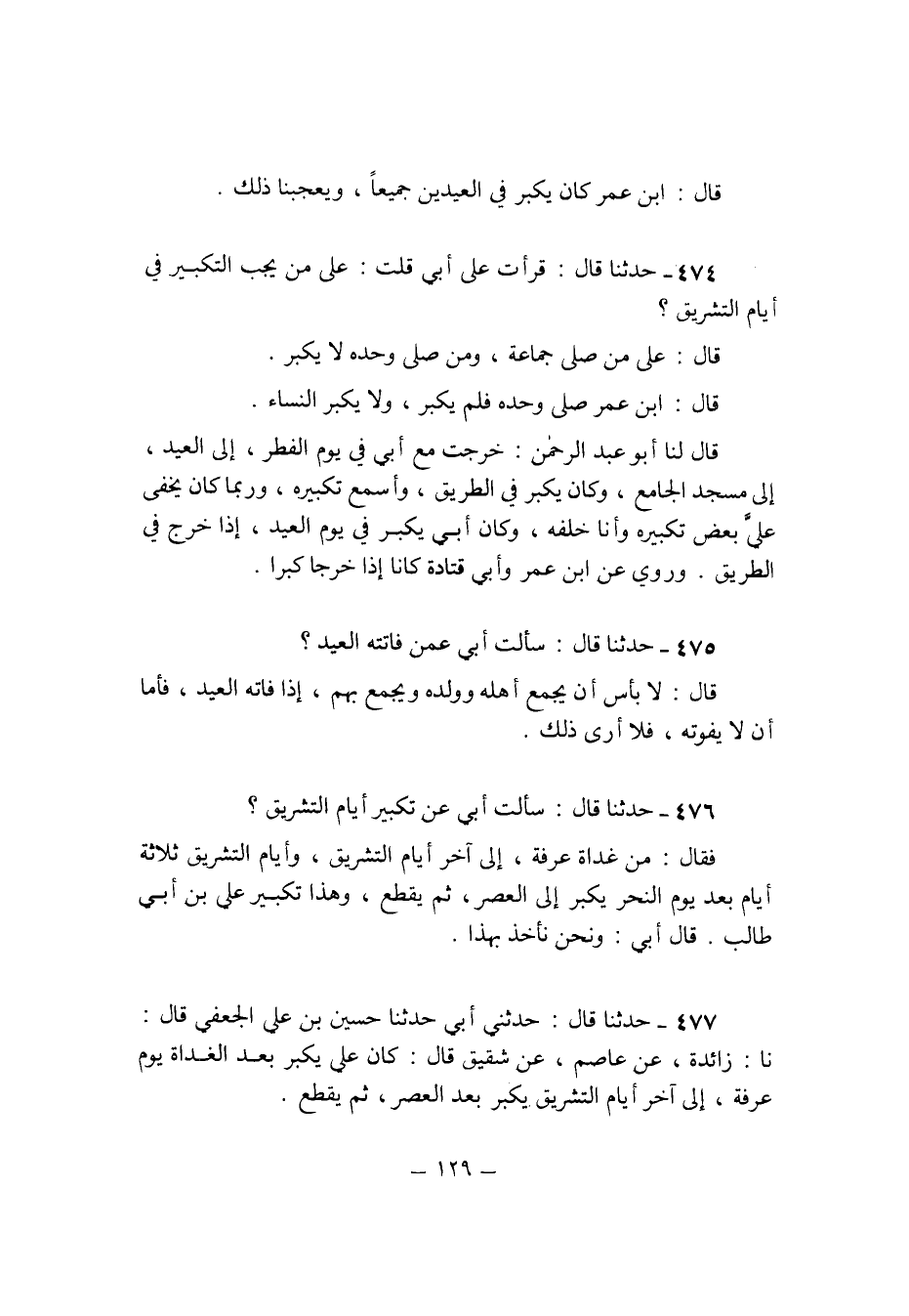 477 - حَدثنَا قَالَ حَدثنِي ابي حُسَيْن بن عَليّ الْجعْفِيّ قَالَ نَا زَائِدَة عَن عَاصِم عَن شَقِيق قَالَ كَانَ عَليّ يكبر بعد الْغَدَاة يَوْم عَرَفَة الى اخر ايام التَّشْرِيق يكبر بعد الْعَصْر ثمَّ يقطع