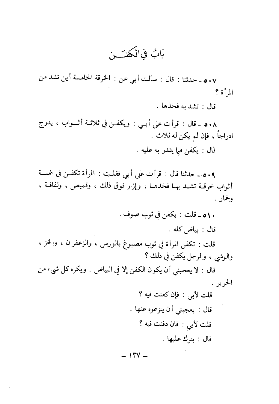 509 - حَدثنَا قَالَ قَرَأت على ابي فَقلت الْمَرْأَة تكفن فِي خَمْسَة اثواب خرقَة تشد بهَا فَخذهَا وَإِزَار فَوق ذَلِك وقميص ولفافة وخمار