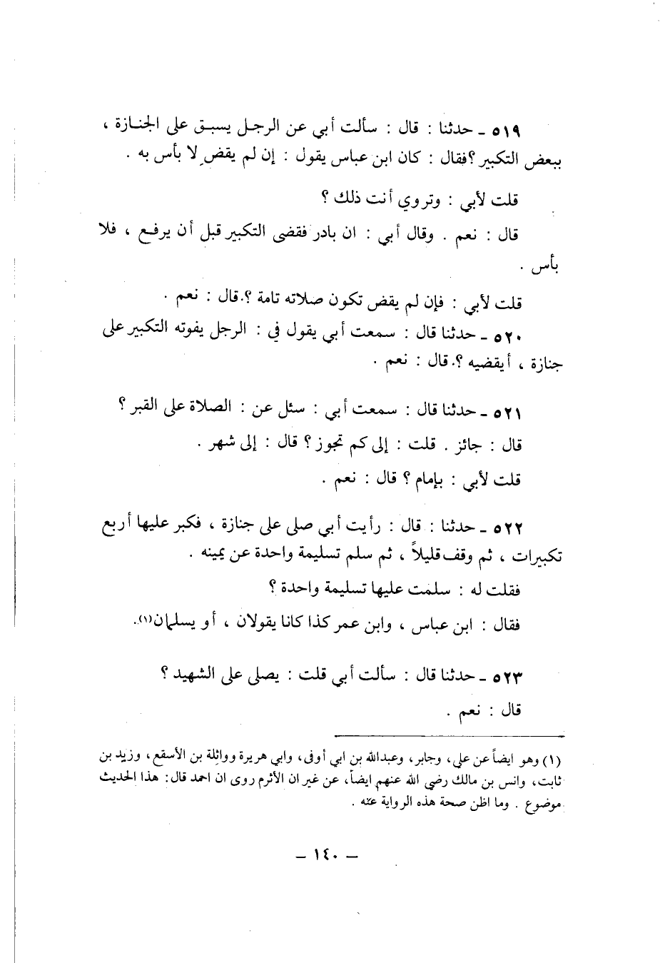 519 - حَدثنَا قَالَ سَأَلت ابي عَن الرجل يسْبق على الْجِنَازَة بِبَعْض التَّكْبِير فَقَالَ كَانَ ابْن عَبَّاس يَقُول إِن لم يقْض لَا بَأْس بِهِ