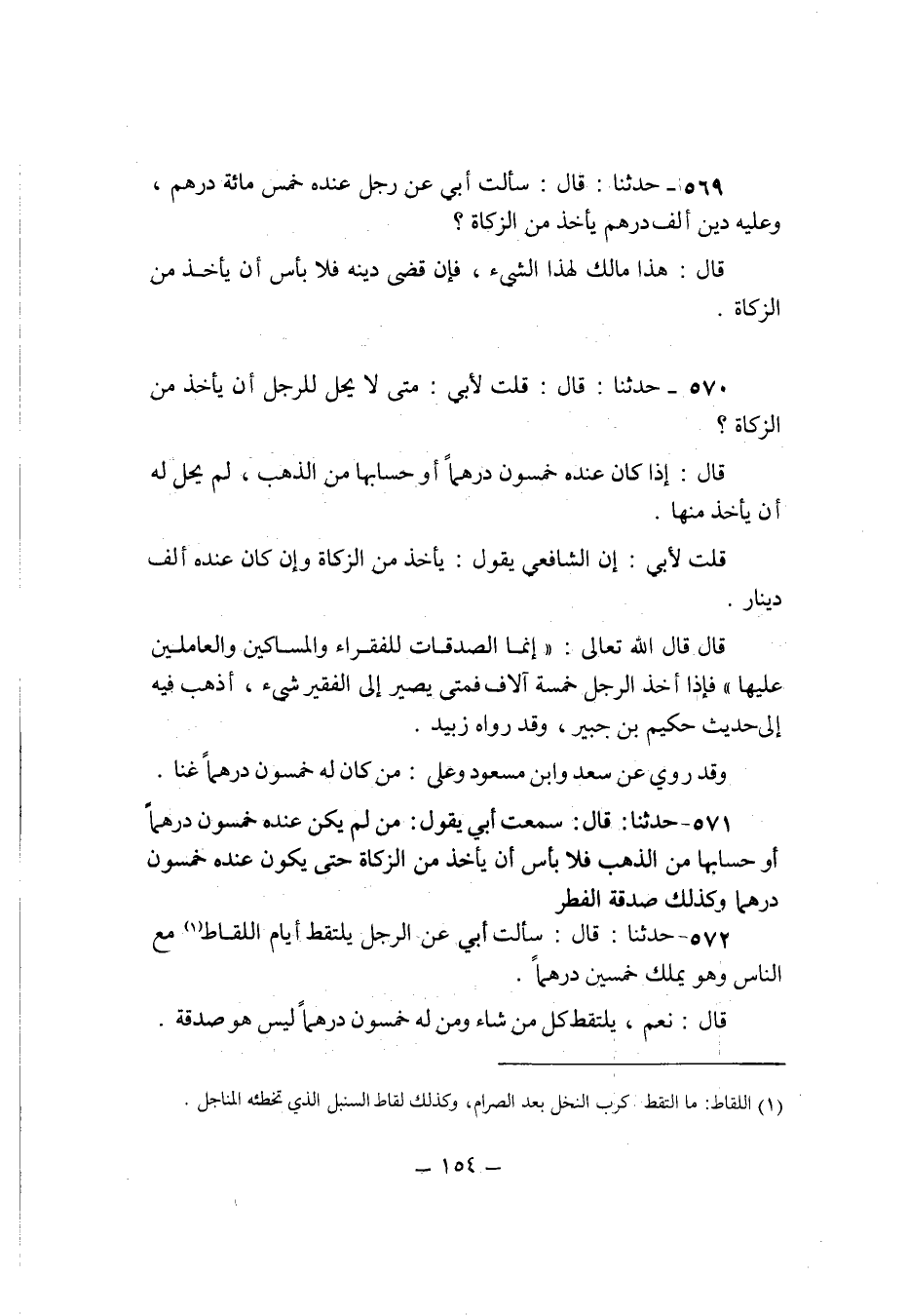 571 - حَدثنَا قَالَ سَمِعت ابي يَقُول من لم يكن عِنْده خَمْسُونَ درهما اَوْ حِسَابهَا من الذَّهَب فَلَا بَأْس ان يَأْخُذ من الزَّكَاة حَتَّى يكون عِنْده خَمْسُونَ درهما وَكَذَلِكَ صَدَقَة الْفطر