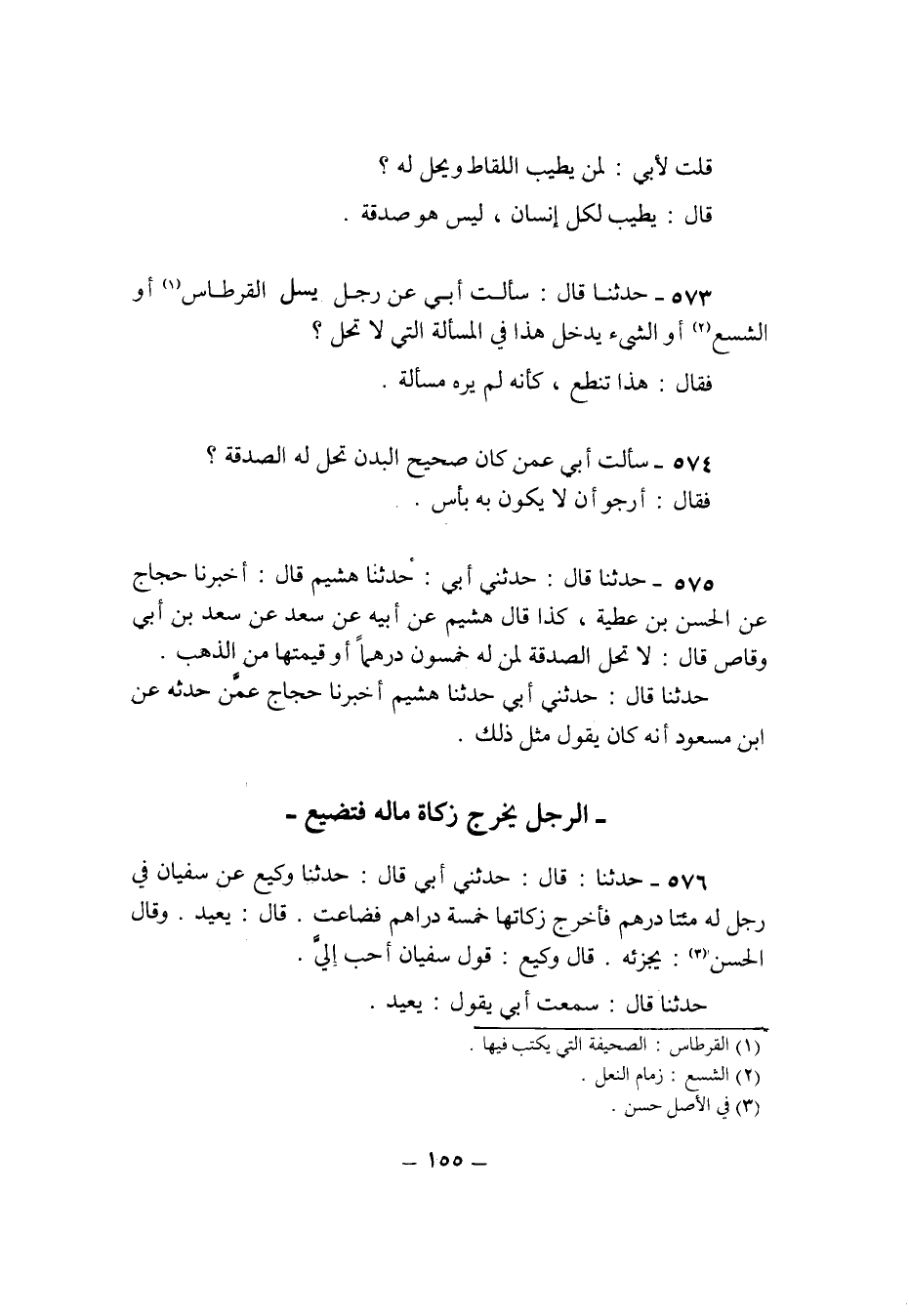 576 - حَدثنَا قَالَ حَدثنِي ابي قَالَ حَدثنَا وَكِيع عَن سُفْيَان فِي رجل لَهُ مئتا دِرْهَم فَأخْرج زَكَاتهَا خَمْسَة دَرَاهِم فَضَاعَت قَالَ يُعِيد وَقَالَ الْحسن يُجزئهُ قَالَ وَكِيع قَول سُفْيَان احب الي