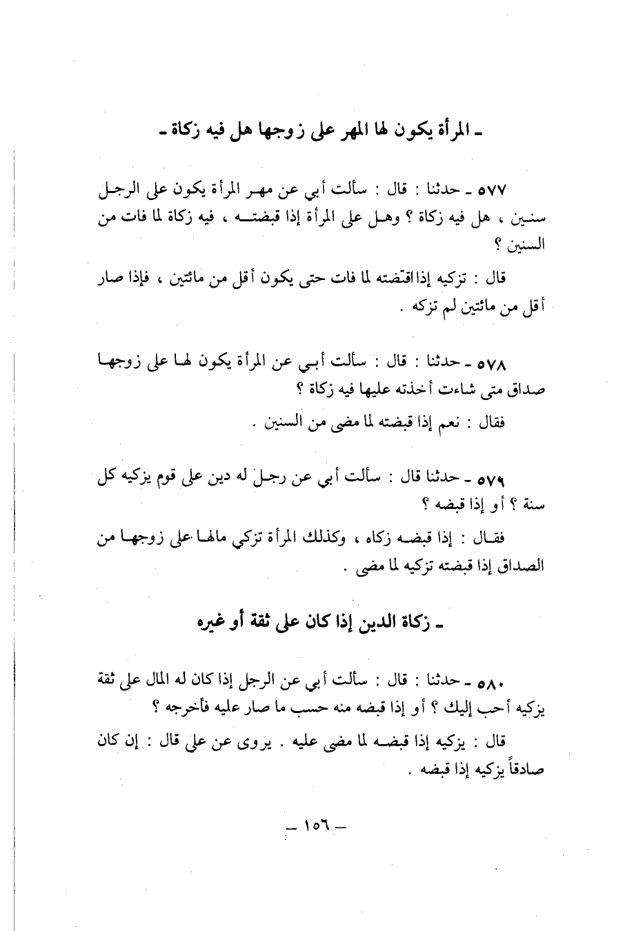578 - حَدثنَا قَالَ سَأَلت ابي عَن الْمَرْأَة يكون لَهَا على زَوجهَا صدَاق مَتى شَاءَت اخذته عَلَيْهَا فِيهِ زَكَاة