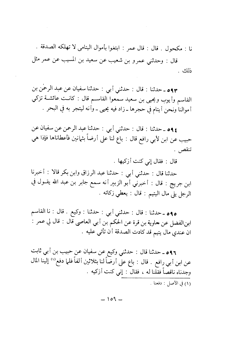 593 - حَدثنَا قَالَ حَدثنِي ابي حَدثنَا سُفْيَان عَن عبد الرَّحْمَن بن الْقَاسِم وَأَيوب وَيحيى بن سعيد سمعُوا الْقَاسِم قَالَ كَانَت عَائِشَة تزكي اموالنا وَنحن ايتام فِي حجرها زَاد فِيهِ يحيى وانه ليتجر بِهِ فِي الْبَحْر