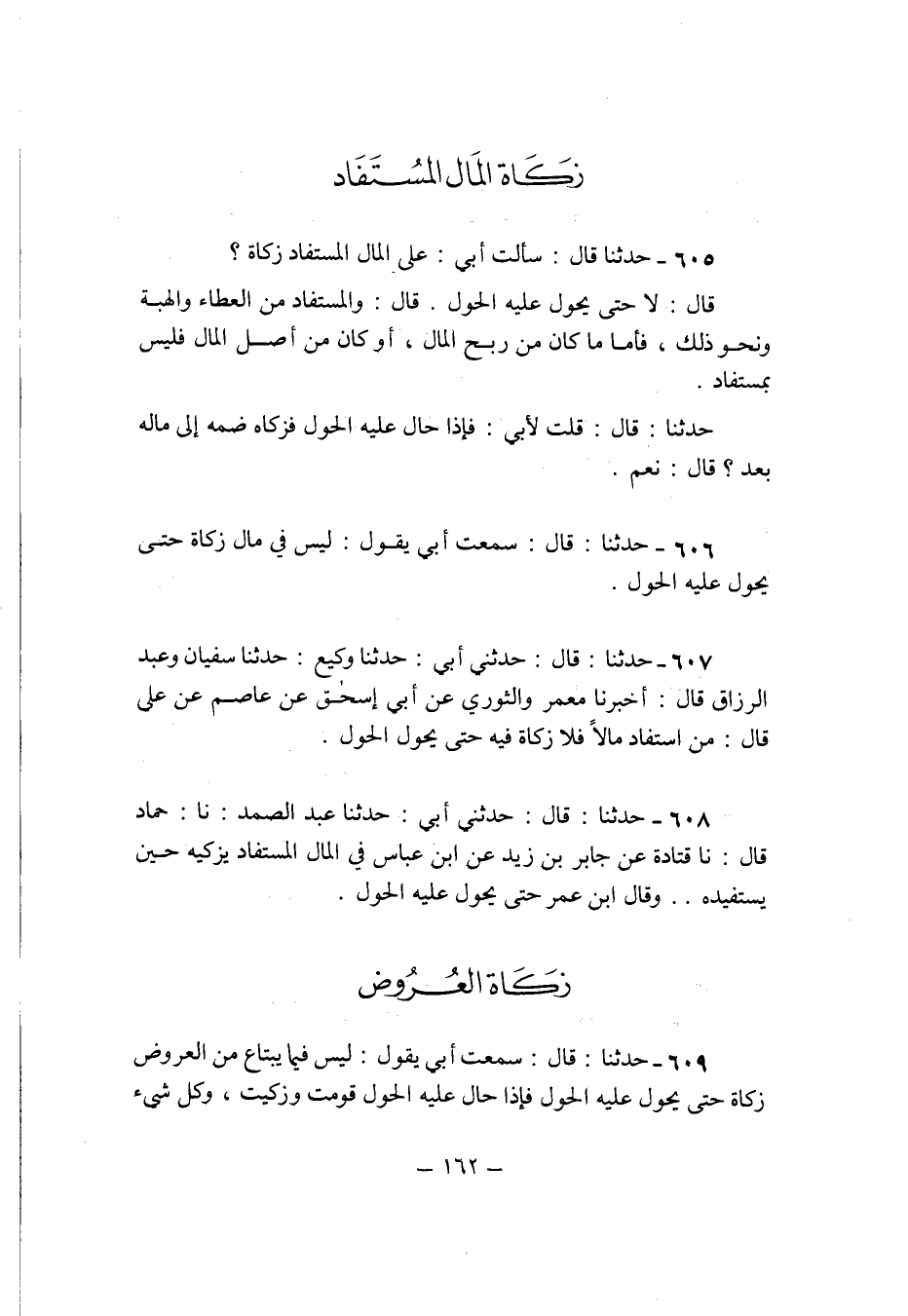 607 - حَدثنَا قَالَ حَدثنِي ابي حَدثنَا وَكِيع حَدثنَا سُفْيَان وَعبد الرَّزَّاق قَالَ اُخْبُرْنَا معمر وَالثَّوْري عَن ابي اسحق عَن عَاصِم عَن عَليّ قَالَ من اسْتَفَادَ مَالا فَلَا زَكَاة فِيهِ حَتَّى يحول الْحول