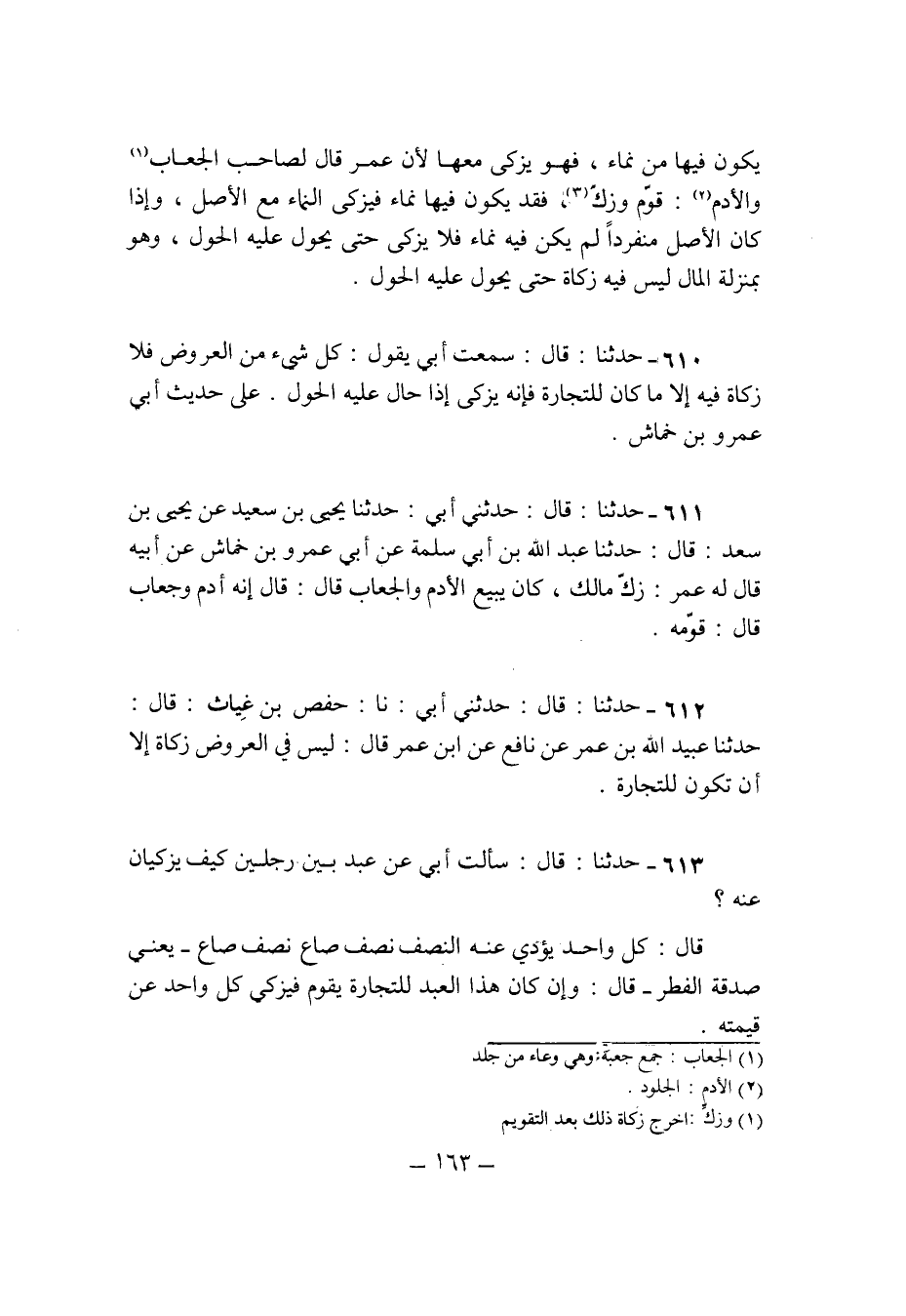 611 - حَدثنَا قَالَ حَدثنِي ابي حَدثنَا يحيى بن سعيد عَن يحيى بن سعد قَالَ حَدثنَا عبد الله بن ابي سَلمَة عَن ابي عَمْرو بن خماش عَن أَبِيه قَالَ لَهُ عمر زك مَالك كَانَ يَبِيع الادم والجعاب قَالَ قَالَ انه أَدَم وجعاب قَالَ قومه
