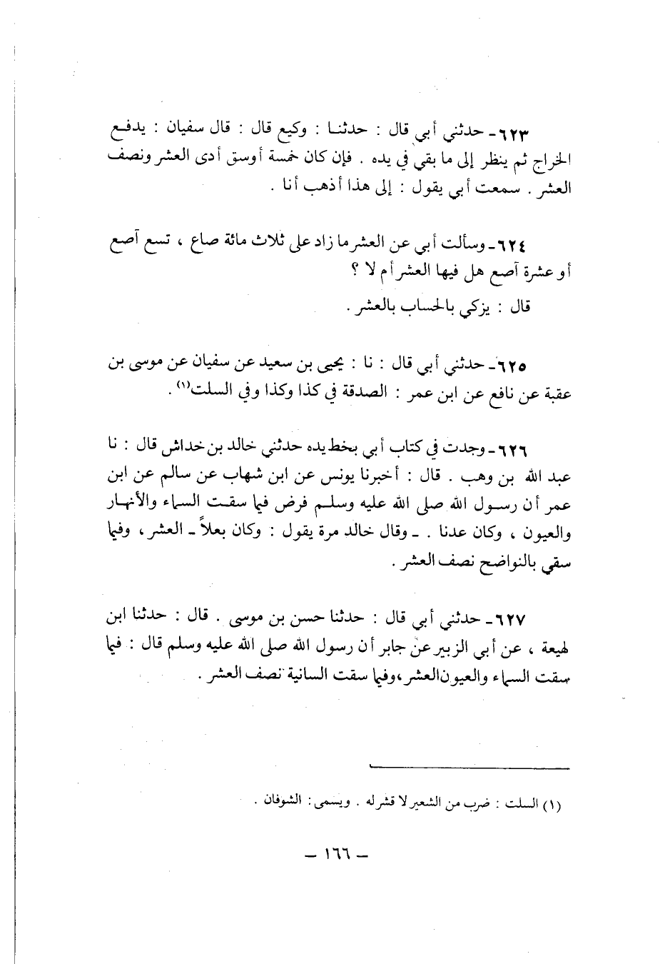 625 - حَدثنِي ابي قَالَ نَا يحيى بن سعيد عَن سُفْيَان عَن مُوسَى بن عقبَة عَن نَافِع عَن ابْن عمر الصَّدَقَة فِي كَذَا وَكَذَا وَفِي السلت