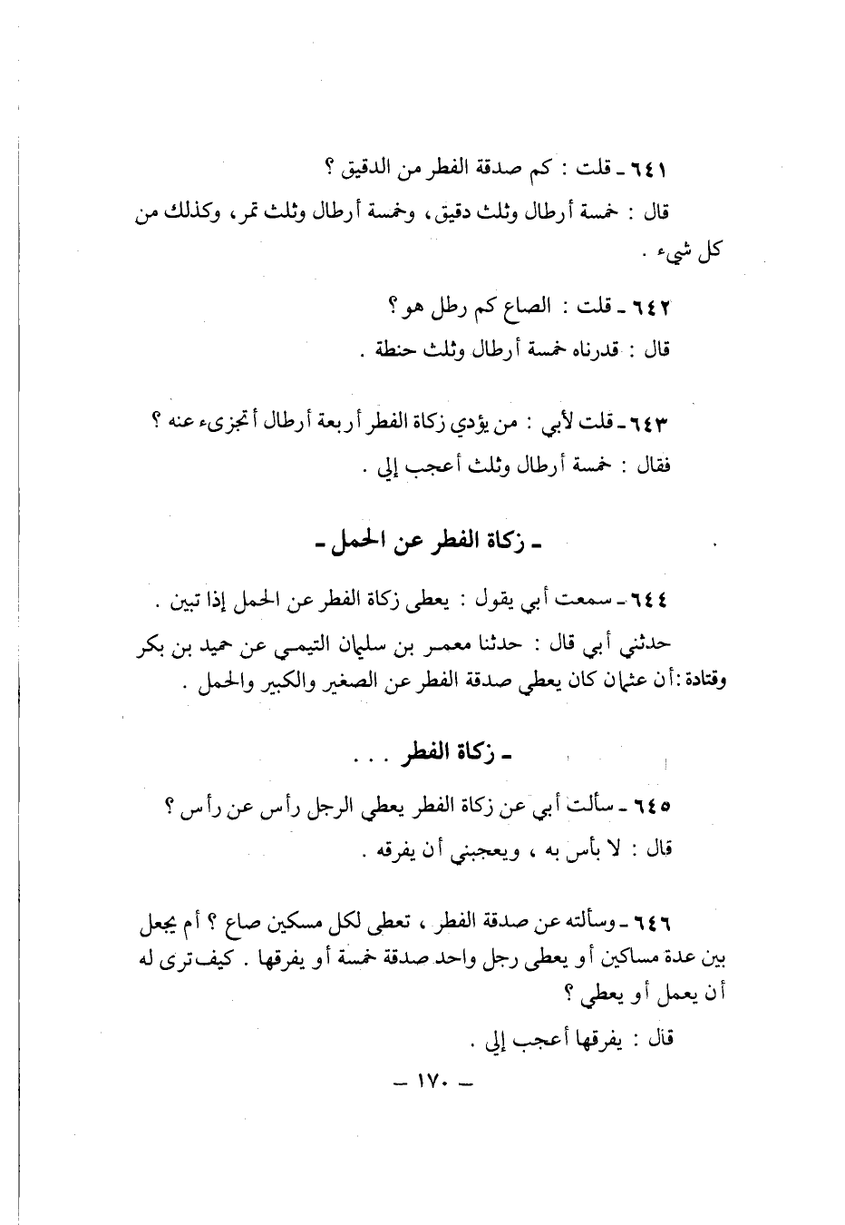 646 - وَسَأَلته عَن صَدَقَة الْفطر تُعْطى لكل مِسْكين صَاع ام يَجْعَل بَين عدَّة مَسَاكِين اَوْ يعْطى رجل وَاحِد صَدَقَة خَمْسَة اَوْ يفرقها كَيفَ ترى لَهُ ان يعْمل اَوْ يعْطى