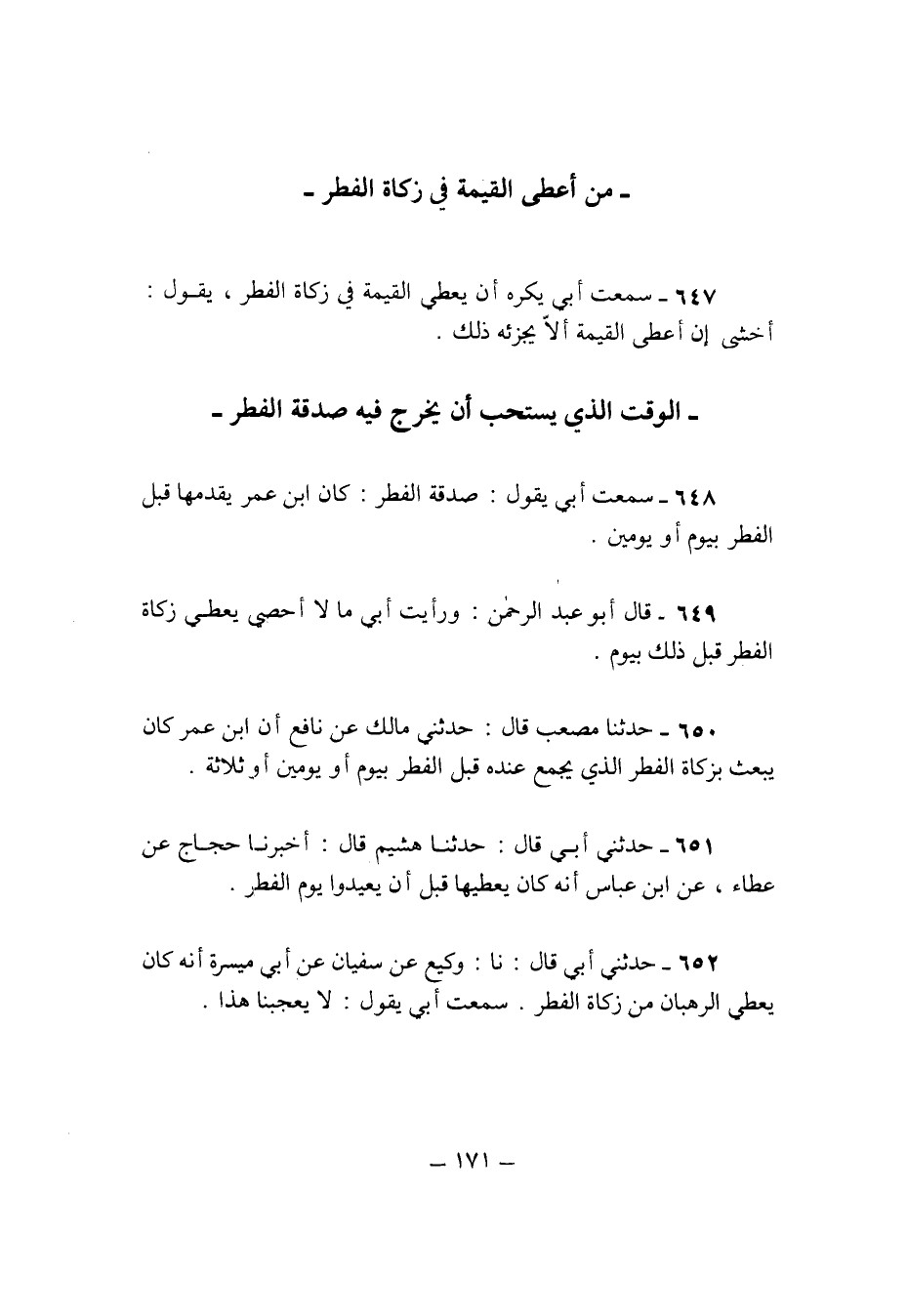 648 - سَمِعت أَبى يَقُول صَدَقَة الْفطر كَانَ ابْن عمر يقدمهَا قبل الْفطر بِيَوْم أَو يَوْمَيْنِ
