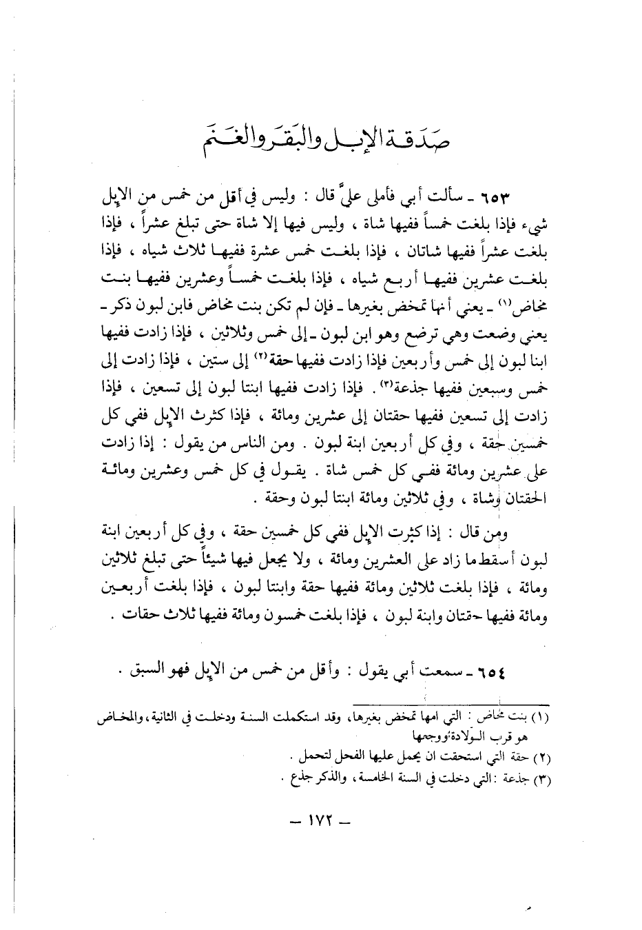 653 - سَأَلت ابي فأملى عَليّ قَالَ وَلَيْسَ فِي اقل من خمس من الابل شَيْء فَإِذا بلغت خمْسا فَفِيهَا شَاة وَلَيْسَ فِيهَا الا شَاة حَتَّى عشرا فَإِذا بلغت عشرا فَفِيهَا شَاتَان فَإِذا بلغت خمس عشرَة فَفِيهَا ثَلَاث شِيَاه فَإِذا بلغت عشْرين فَفِيهَا ارْبَعْ شِيَاه فَإِذا بلغت خمْسا وَعشْرين فَفِيهَا بنت مَخَاض يَعْنِي انها تمخض بغَيْرهَا فَإِن لم تكن بنت مَخَاض فَابْن لبون ذكر يَعْنِي وضعت وَهِي ترْضع وَهُوَ ابْن لبون الى خمس وَثَلَاثِينَ فَإِذا زَادَت فَفِيهَا ابْنا لبون الى خمس واربعين فَإِذا زَادَت فَفِيهَا حَقه الى سِتِّينَ فَإِذا زَادَت الى خمس وَسبعين فَفِيهَا جذعه فَإِذا زَادَت فَفِيهَا ابنتا لبون الى تسعين فَإِذا زَادَت الى تسعين فَفِيهَا حقتان الى عشْرين وَمِائَة فَإِذا كثرت الابل فَفِي كل خمسين حقة وَفِي كل اربعين ابْنة لبون وَمن النَّاس من يَقُول اذا زَادَت على عشْرين وَمِائَة فَفِي كل خمس شَاة يَقُول فِي كل خمس وَعشْرين وَمِائَة الحقتان وشَاة وَفِي ثَلَاثِينَ وَمِائَة ابنتا لبون وحقة
