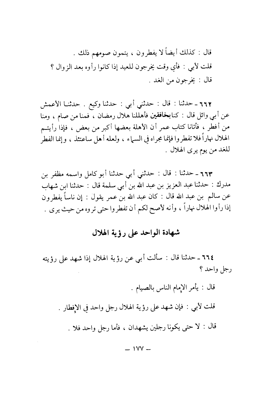 662 - حَدثنَا قَالَ حَدثنِي ابي حَدثنَا وَكِيع حَدثنَا الاعمش عَن ابي وَائِل قَالَ كُنَّا بخافقين فأهللنا هِلَال رَمَضَان فمنا من صَامَ وَمنا من افطر فَأَتَانَا كتاب عمر ان الاهلة بَعْضهَا اكبر من بعض فَإِذا رَأَيْتُمْ الْهلَال نَهَارا فَلَا تفطروا فَإِنَّمَا مجْرَاه فِي السَّمَاء وَلَعَلَّه اهل ساعتئذ وانما الْفطر للغد من يَوْم يرى الْهلَال