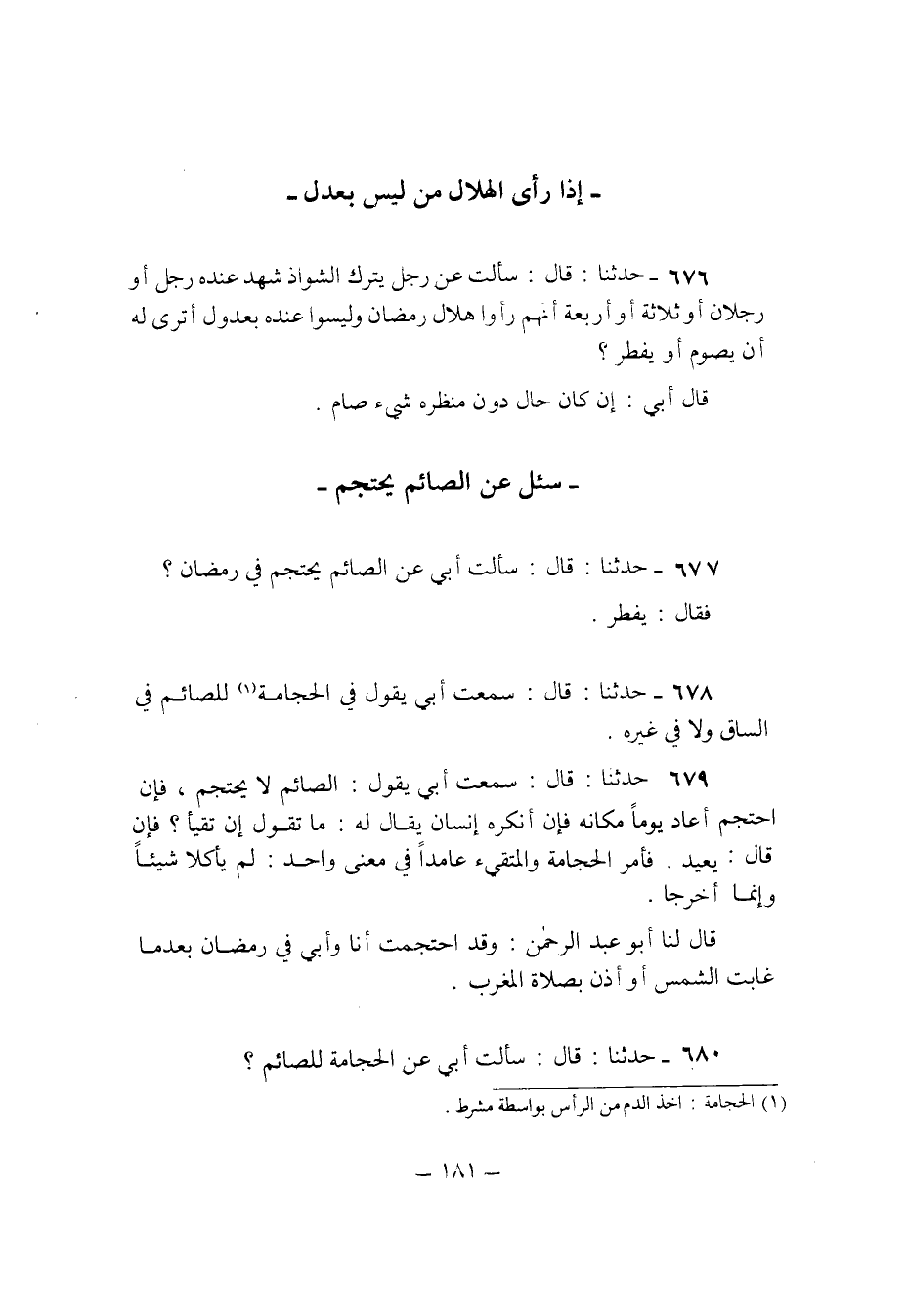 679 - حَدثنَا قَالَ سَمِعت ابي يَقُول الصَّائِم لَا يحتجم فَإِن احْتجم اعاد يَوْمًا مَكَانَهُ فَإِن انكره إِنْسَان يُقَال لَهُ مَا تَقول إِن تقيأ فَإِن قَالَ يُعِيد فَأمر الْحجامَة والمتقيء عَامِدًا فِي معنى وَاحِد لم يأكلا شَيْئا وانما اخرجا