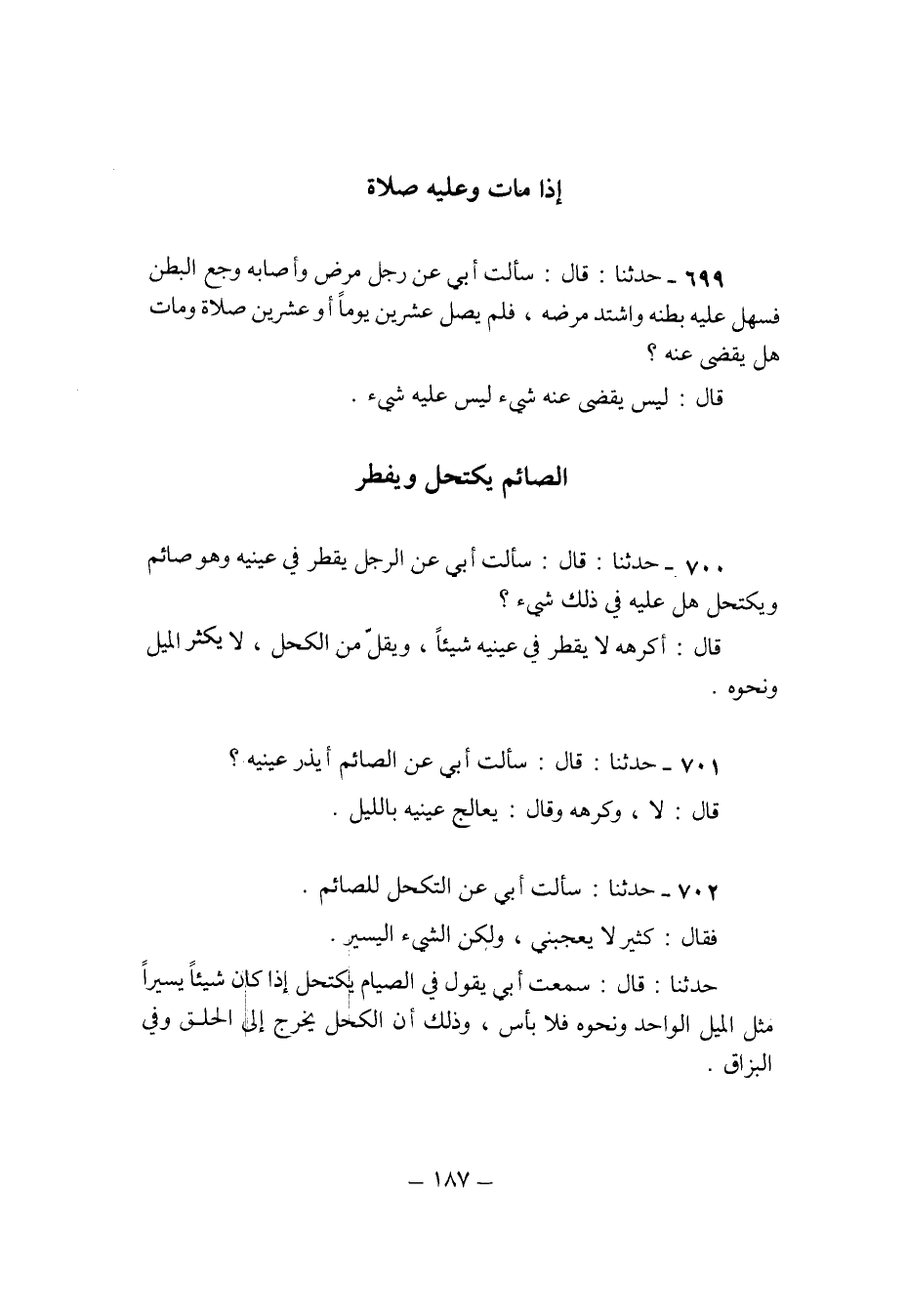700 - حَدثنَا قَالَ سَأَلت ابي عَن الرجل يقطر فِي عَيْنَيْهِ وَهُوَ صَائِم ويكتحل هَل عَلَيْهِ فِي ذَلِك شَيْء