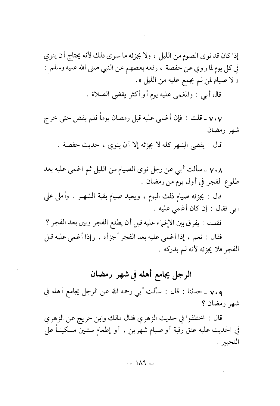 709 - حَدثنَا قَالَ سَأَلت ابي رَحمَه الله عَن الرجل يُجَامع اهله فِي شهر رَمَضَان