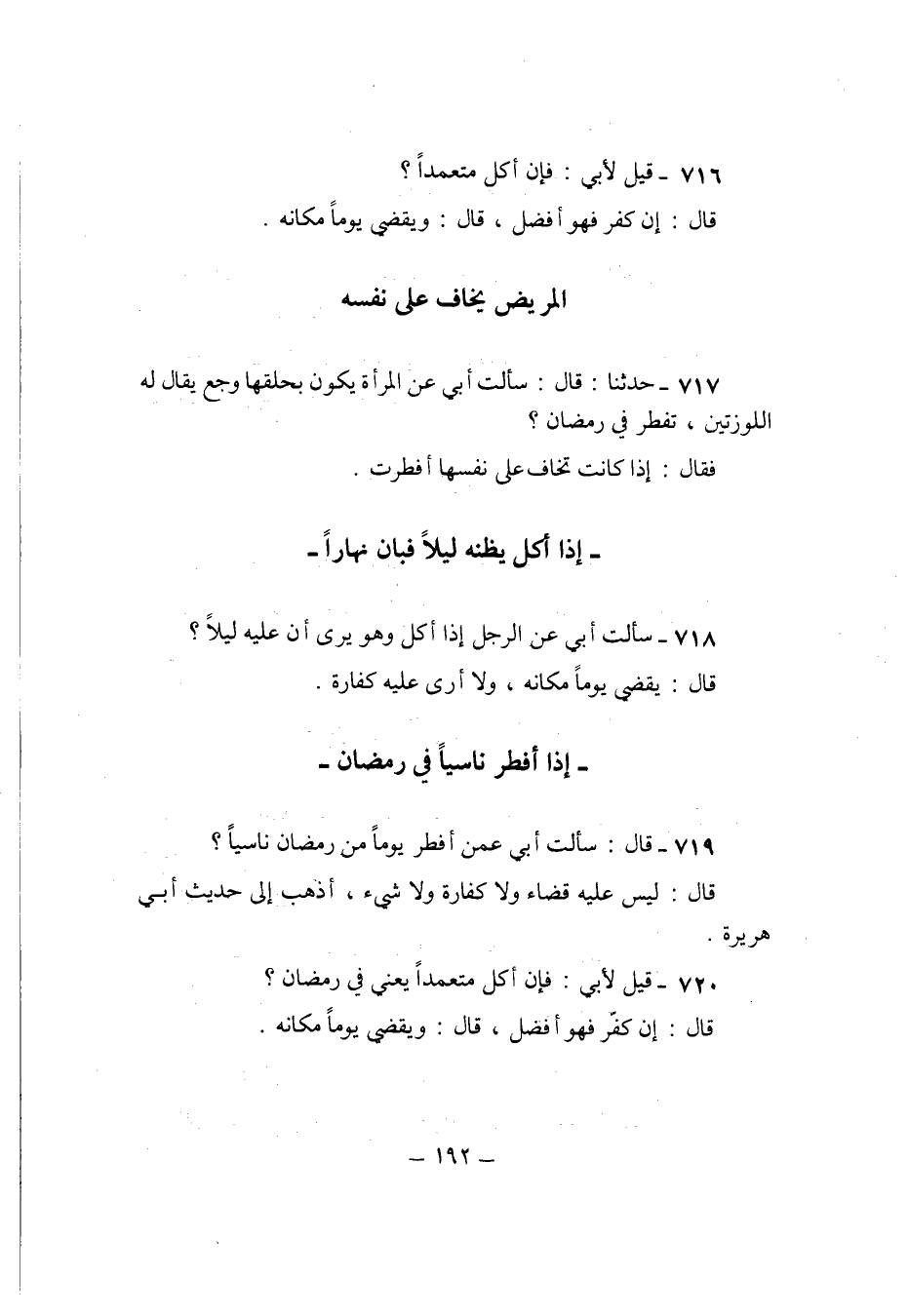 719 - قَالَ سَأَلت ابي عَمَّن افطر يَوْمًا من رَمَضَان نَاسِيا