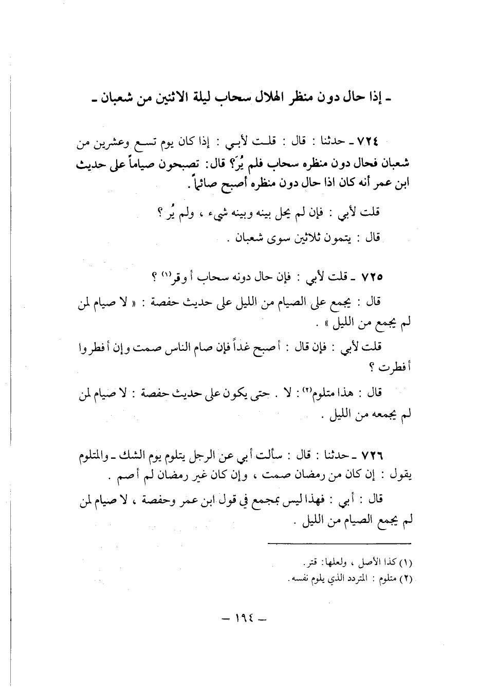 724 - حَدثنَا قَالَ قلت لابي اذا كَانَ يَوْم تسع وَعشْرين من شعْبَان فحال دون منظره سَحَاب فَلم ير قَالَ تُصبحُونَ صياما على حَدِيث ابْن عمر انه كَانَ اذا حَال دون منظره اصبح صَائِما