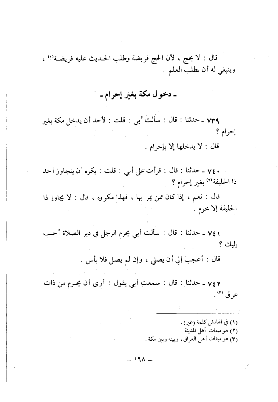 740 - حَدثنَا قَالَ قَرَأت على ابي قلت يكره ان يتَجَاوَز اُحْدُ ذَا الحليفة بِغَيْر إِحْرَام