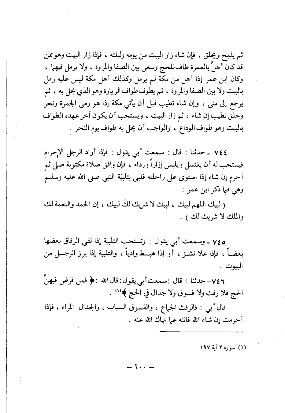 745 - وَسمعت ابي يَقُول وتستحب التَّلْبِيَة اذا لَقِي الرفاق بَعْضهَا بَعْضًا فَإِذا علا نشز اَوْ اذا هَبَط وَاديا والتلبية اذا برز الرجل من الْبيُوت