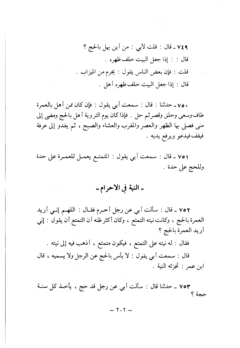 750 - حَدثنَا قَالَ سَمِعت ابي يَقُول فَإِن كَانَ مِمَّن اهل بِالْعُمْرَةِ طَاف وسعى وَحلق وَقصر ثمَّ حل فَإِذا كَانَ يَوْم التَّرويَة اهل بِالْحَجِّ وَمضى الى منى فصلى بهَا الظّهْر وَالْعصر وَالْمغْرب وَالْعشَاء وَالصُّبْح ثمَّ يَغْدُو الى عَرَفَة فيقف فيدعو وَيرْفَع يَدَيْهِ