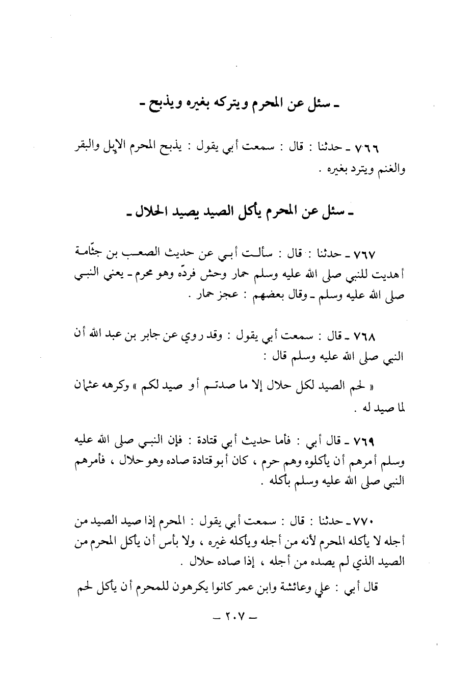 770 - حَدثنَا قَالَ سَمِعت ابي يَقُول الْمحرم اذا صيد الصَّيْد من اجله لَا يَأْكُلهُ الْمحرم لِأَنَّهُ من أَجله ويأكله غَيره وَلَا بَأْس ان يَأْكُل الْمحرم من الصَّيْد الَّذِي لم يصده من أَجله اذا صَاده حَلَال